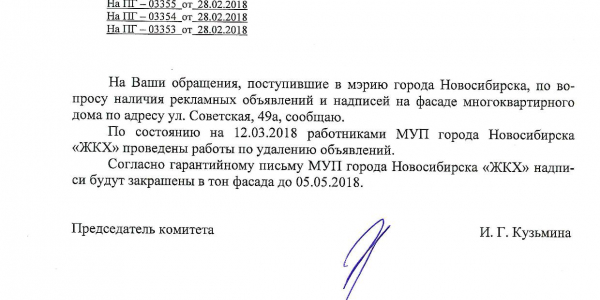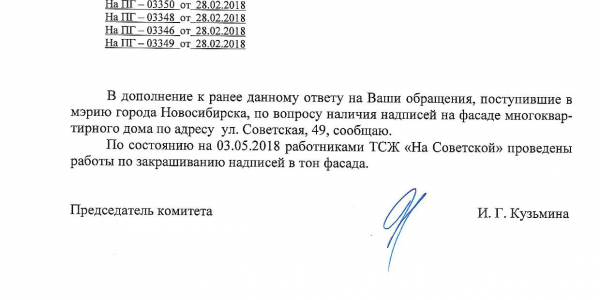 Номер жалобы:30741 Тип жалобы:Иные проблемы ЖКХ Название объекта:Управляющая Компания Регион:Новосибирская область Город:Новосибирск Адрес:ул. Советская, 49А Описание жалобы:Надписи на фасаде дома Статус: