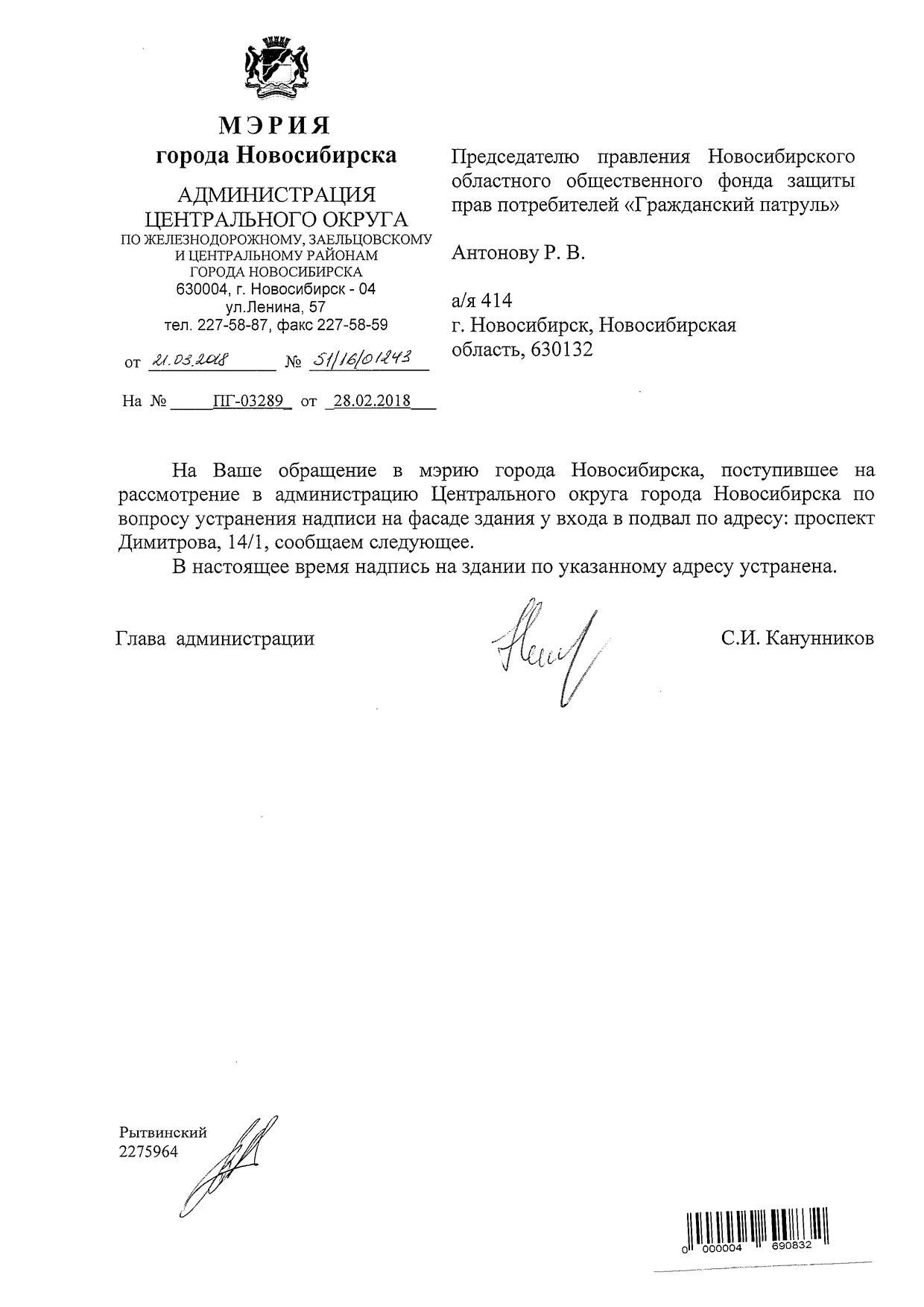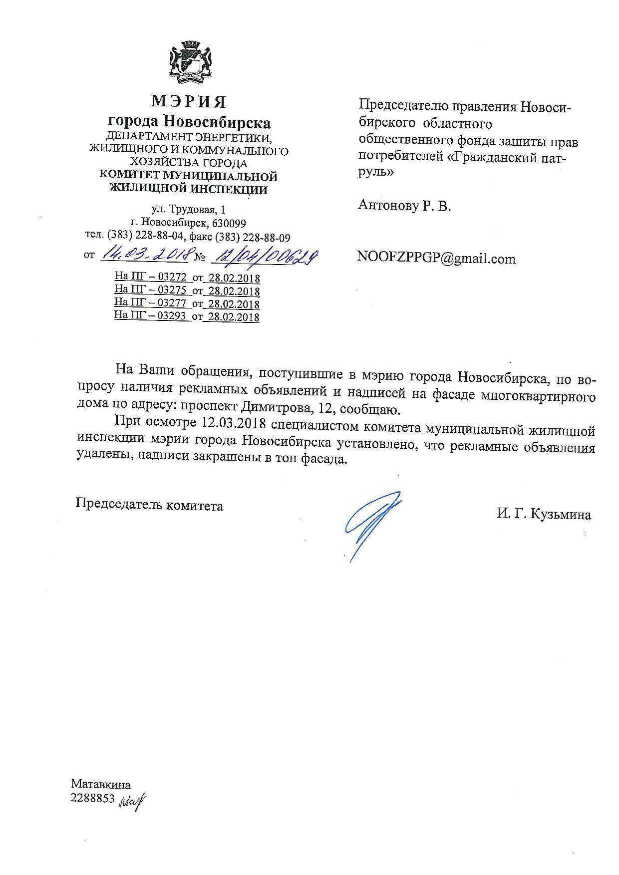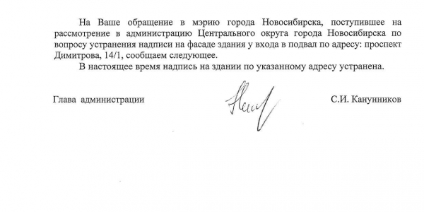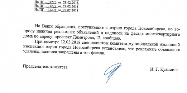 Номер жалобы:30732 Тип жалобы:Иные проблемы ЖКХ Название объекта:Управляющая Компания Регион:Новосибирская область Город:Новосибирск Адрес:пр. Димитрова, 10 Описание жалобы:Вокзальная магистраль 13, надписи закрашены на фасаде не в тон Статус: