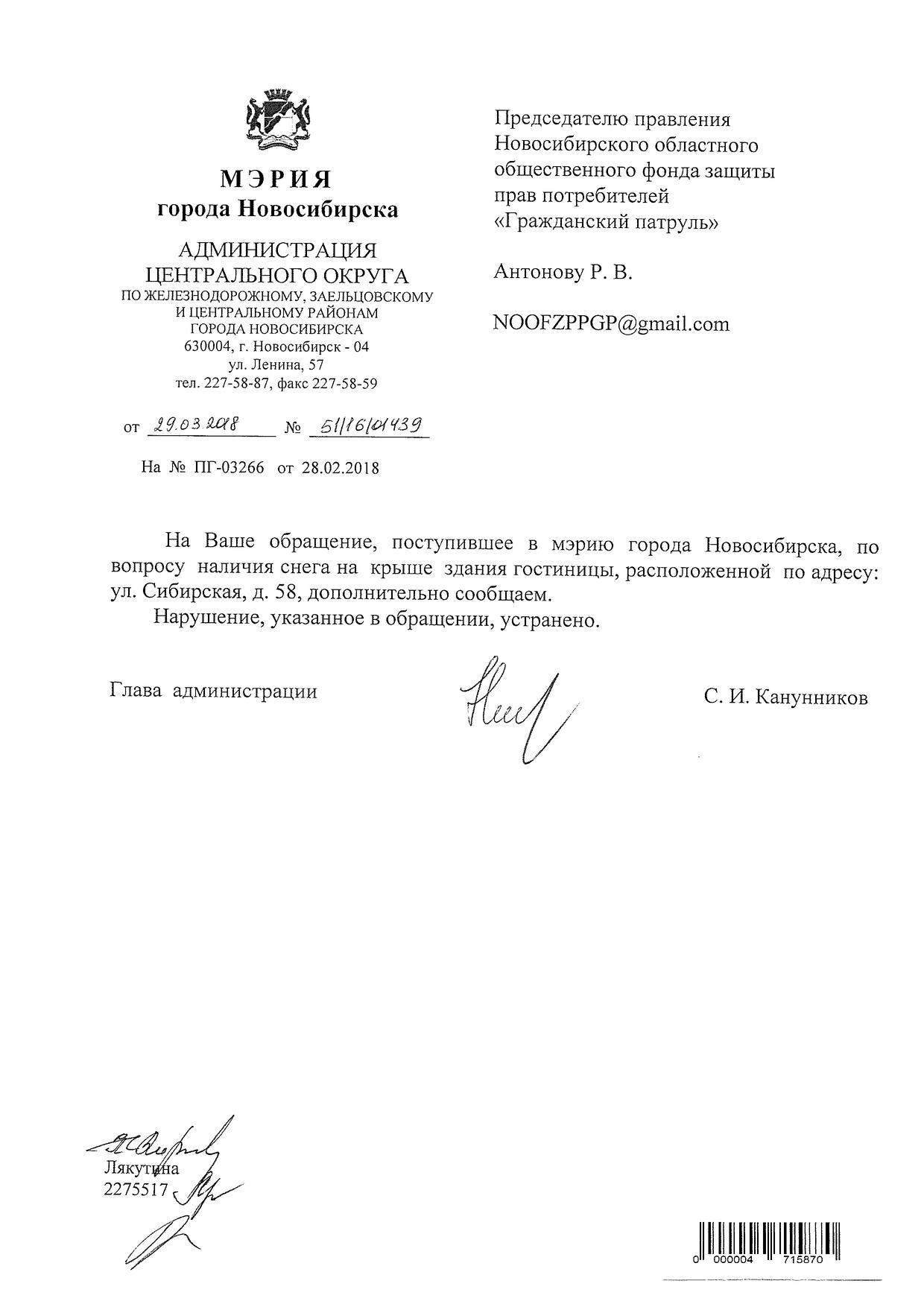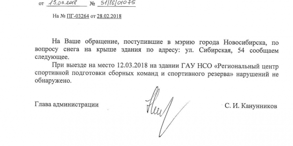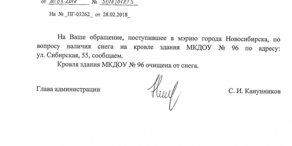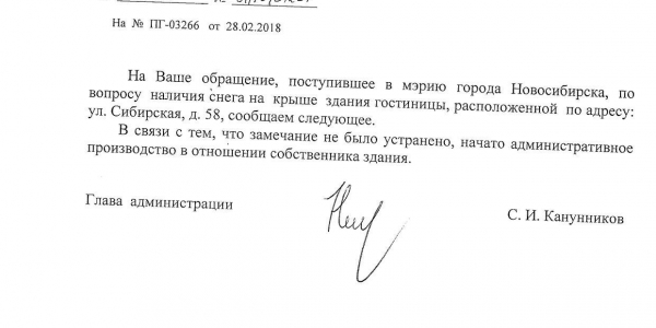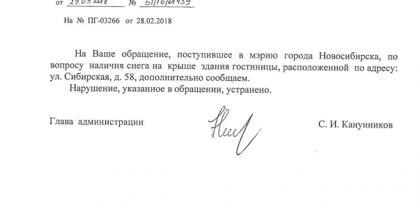 Номер жалобы:30721 Тип жалобы:Иные проблемы ЖКХ Название объекта:Управляющая Компания Регион:Новосибирская область Город:Новосибирск Адрес:ул. Сибирская, 54/1 Описание жалобы:Сибирская 54, снег на крыше дома Статус: