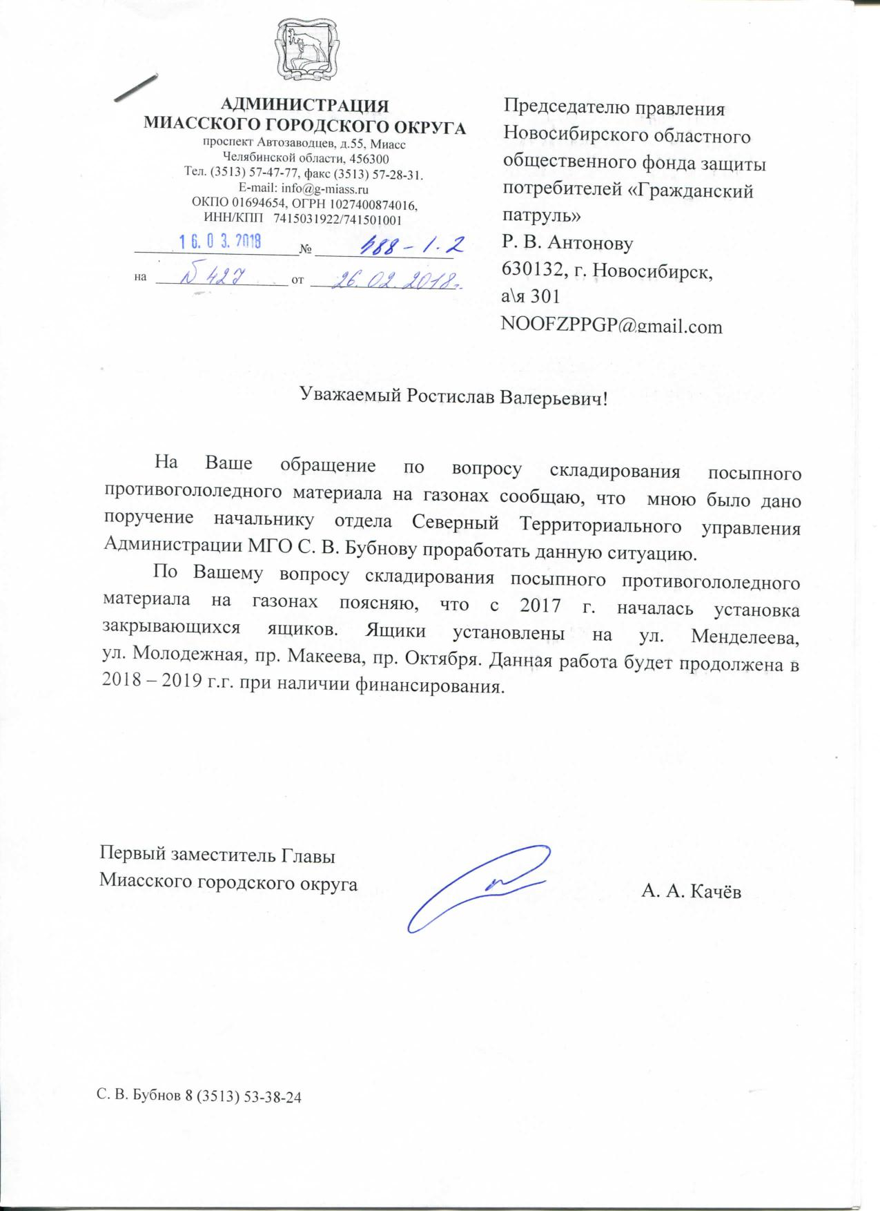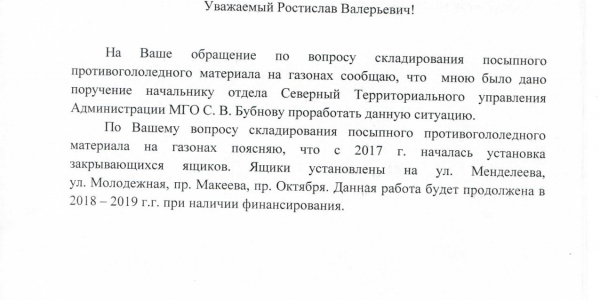 Номер жалобы:30587 Тип жалобы:Иные проблемы ЖКХ Название объекта:Администрация МГО Регион:Челябинская область Город:Миасс Адрес:ул. Жуковского, 7 Описание жалобы:Просьба приспособить для попыспки тротуаров ящики или баки. Такого рода кучи лежат по всему Северному территориальному округу: на газонах(на которых уже ничего не растет после этой кучи), на дорожках,возле тротуаров. Такого рода кучи для посыпок портят внешний вид и вредяд зеленым насаждениям. Статус: