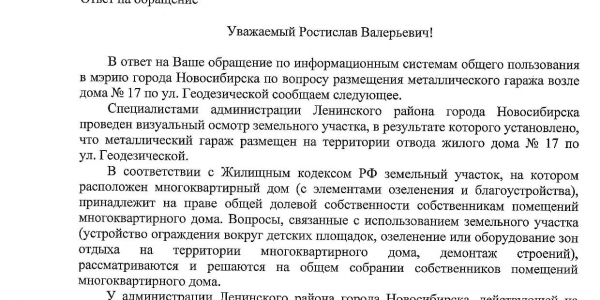 Номер жалобы:30611 Тип жалобы:Иные проблемы ЖКХ Название объекта:Управляющая Компания Город:Новосибирск Адрес:Новосибирск, улица Геодезическая, 17 Описание жалобы:Гаражи Статус: