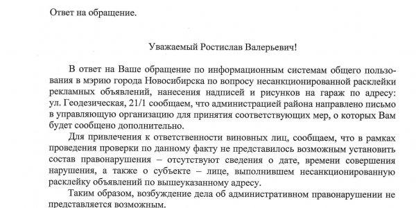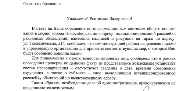 Номер жалобы:30627 Тип жалобы:Иные проблемы ЖКХ Название объекта:Управляющая Компания Город:Новосибирск Адрес:Новосибирск, улица Геодезическая, 21/1 Описание жалобы:Комментарий Статус: