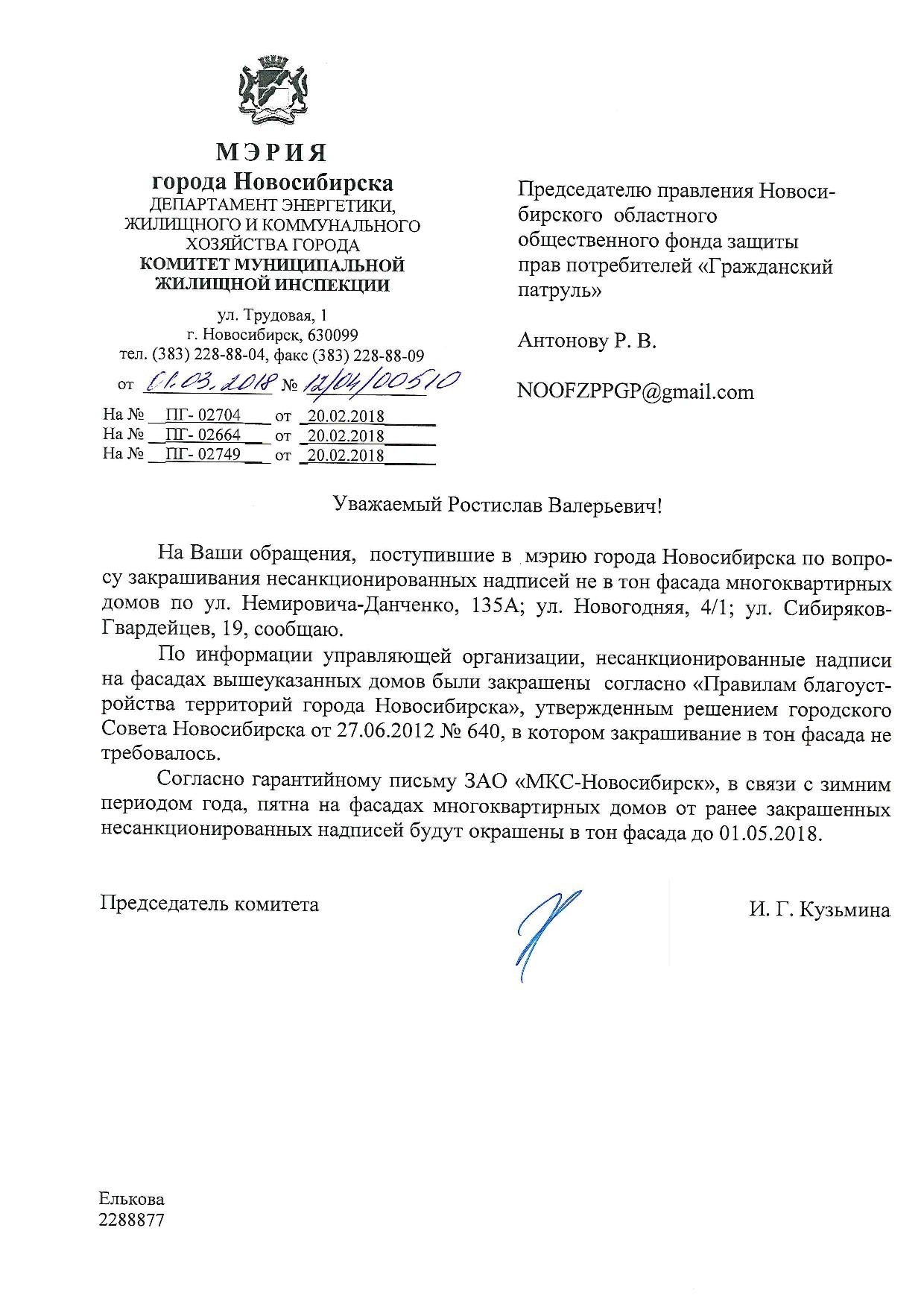 Номер жалобы:30462 Тип жалобы:Иные проблемы ЖКХ Название объекта:Управляющая Компания Город:Новосибирск Адрес:Новосибирск, улица Сибиряков-Гвардейцев, 19 Описание жалобы:Фасад дома разрисован Статус: