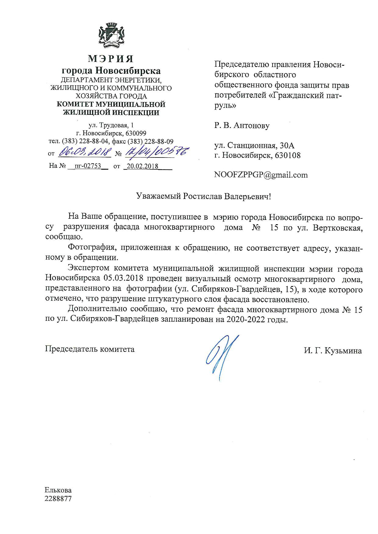 Номер жалобы:30445 Тип жалобы:Иные проблемы ЖКХ Название объекта:Управляющая Компания Город:Новосибирск Адрес:Новосибирск, улица Вертковская, 15 Описание жалобы:Рушится фасад дома Статус: