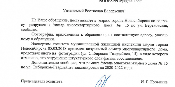 Номер жалобы:30443 Тип жалобы:Иные проблемы ЖКХ Название объекта:Управляющая Компания Город:Новосибирск Адрес:Новосибирск, улица Сибиряков-Гвардейцев, 15/1 Описание жалобы:Рушится фасад Статус:
