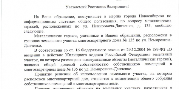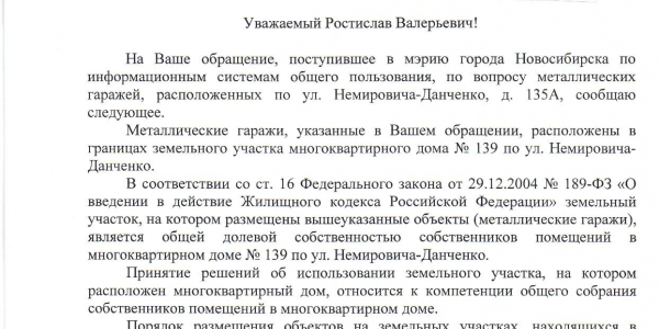 Номер жалобы:30486 Тип жалобы:Иные проблемы ЖКХ Название объекта:Управляющая Компания Город:Новосибирск Адрес:Новосибирск, улица Немировича-Данченко, 135А Описание жалобы:Гаражи Статус: