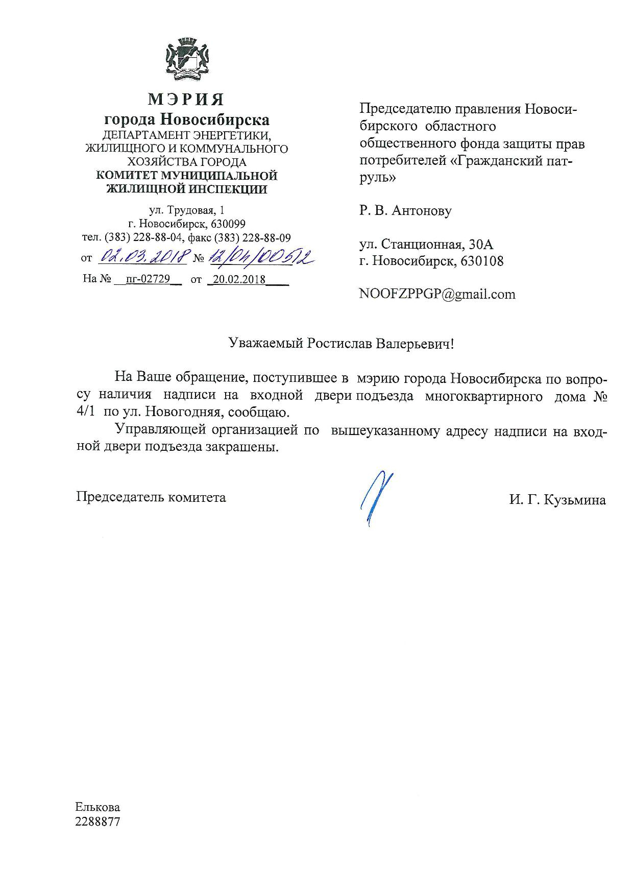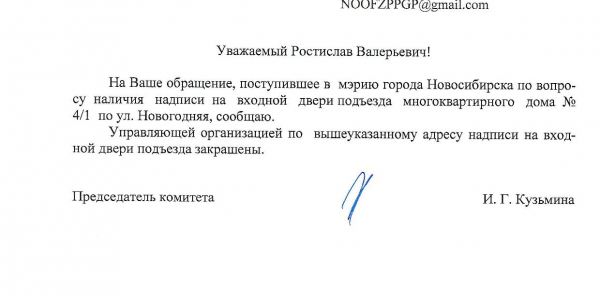 Номер жалобы:30430 Тип жалобы:Иные проблемы ЖКХ Название объекта:Управляющая Компания Город:Новосибирск Адрес:Новосибирск, улица Новогодняя, 4/1 Описание жалобы:Дверь разрисована Статус:
