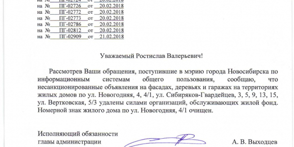 Номер жалобы:30426 Тип жалобы:Иные проблемы ЖКХ Название объекта:Управляющая Компания Город:Новосибирск Адрес:Новосибирск, улица Новогодняя, 4/1 Описание жалобы:Фасад разрисован Статус: