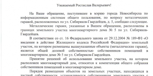 Номер жалобы:30418 Тип жалобы:Иные проблемы ЖКХ Название объекта:Управляющая Компания Город:Новосибирск Адрес:Новосибирск, улица Сибиряков-Гвардейцев, 5 Описание жалобы:Гаражи Статус: