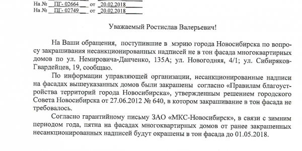 Номер жалобы:30423 Тип жалобы:Иные проблемы ЖКХ Название объекта:Управляющая Компания Город:Новосибирск Адрес:Новосибирск, улица Сибиряков-Гвардейцев, 3 Описание жалобы:Фасад разрисован Статус: