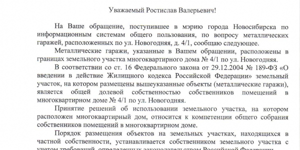 Номер жалобы:30428 Тип жалобы:Иные проблемы ЖКХ Название объекта:Управляющая Компания Город:Новосибирск Адрес:Новосибирск, улица Новогодняя, 4/1 Описание жалобы:Гаражи во дворе Статус:
