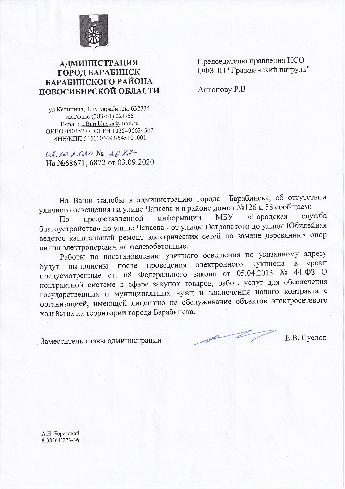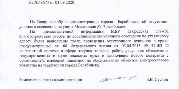 Номер жалобы:68672 Тип жалобы:Прочее Название объекта: Регион:Новосибирская область Город:Барабинск Адрес:улица Чапаева, 126 Описание жалобы:Нет освещения улицы. Сейчас школа началась дети будут ходить по темноте. Статус: