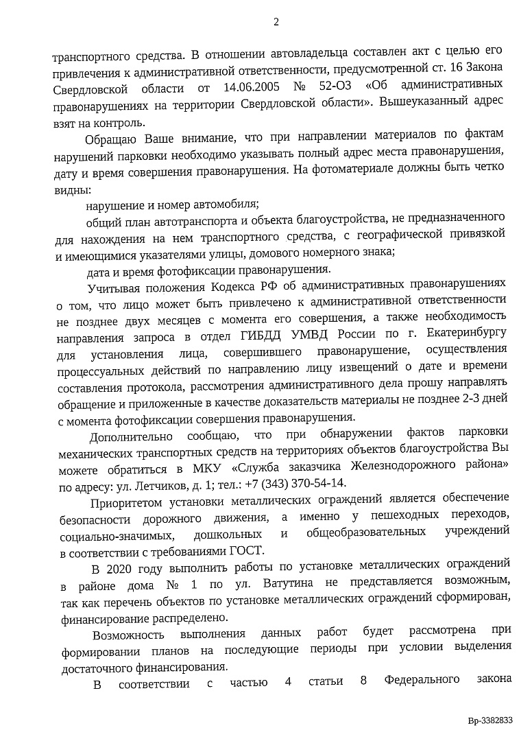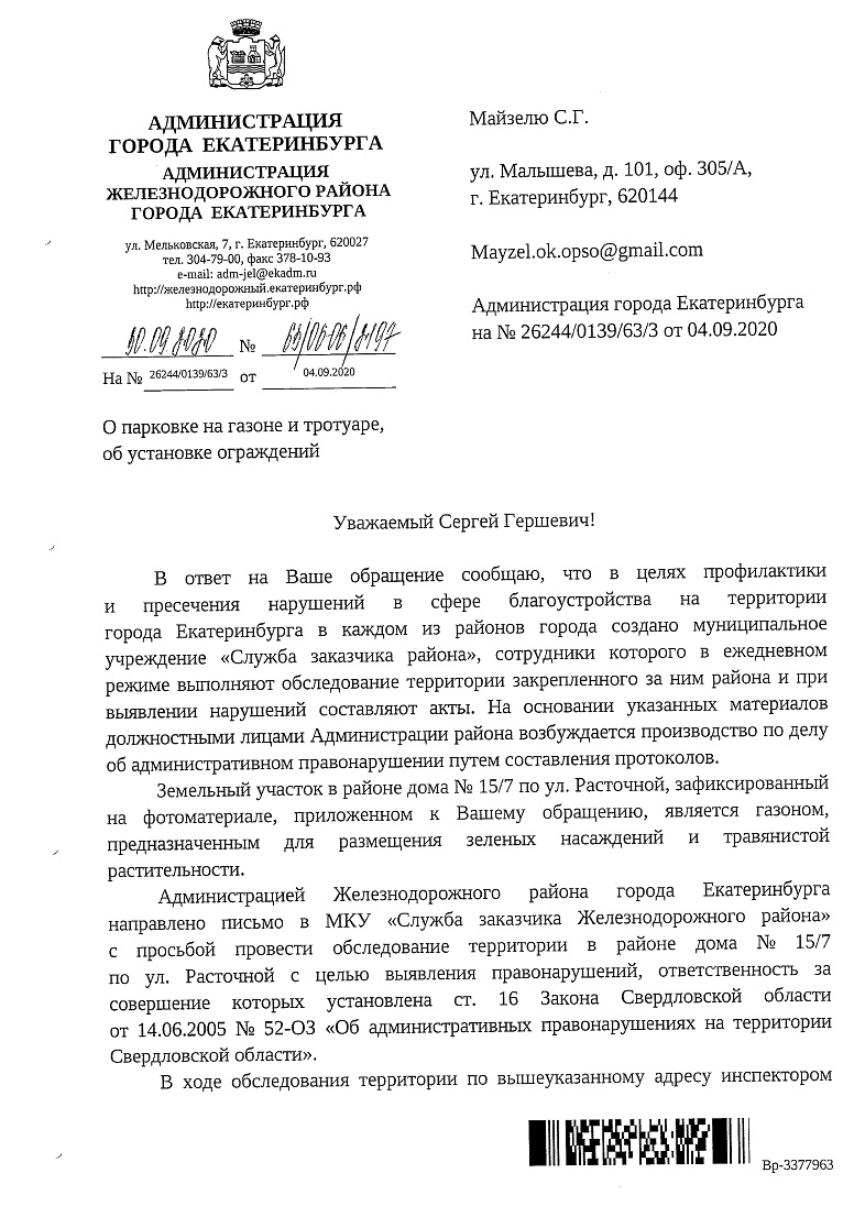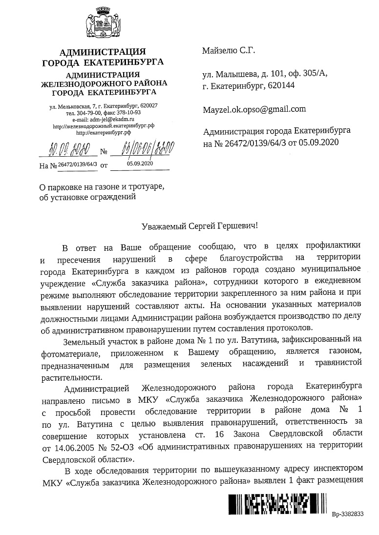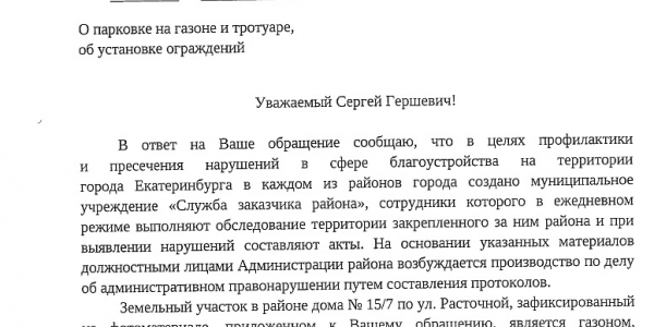 Номер жалобы:68664 Тип жалобы:Прочее Название объекта:мэрия Регион:Свердловская область Город:Екатеринбург Адрес:улица Ватутина, 1 Описание жалобы:Стоянка на газоне. Статус: