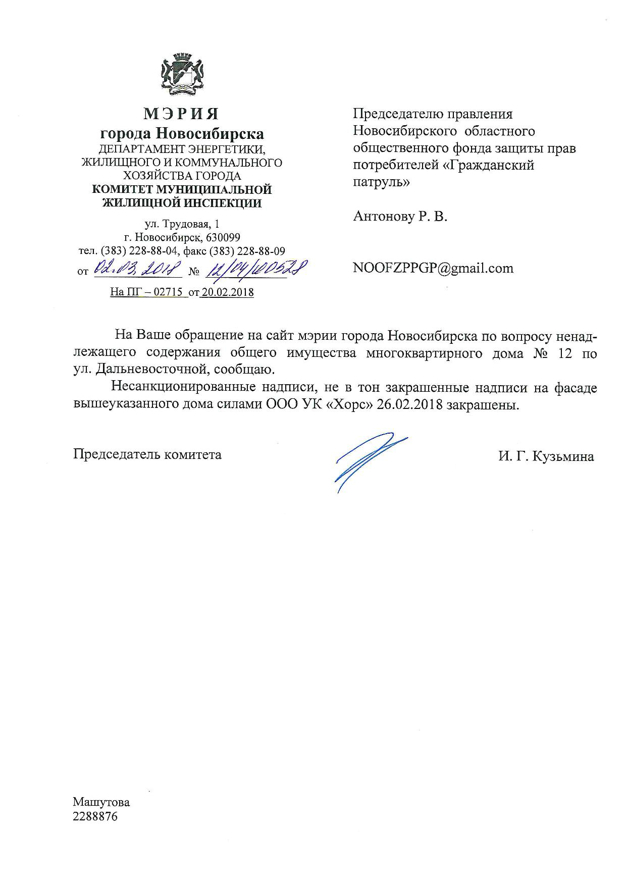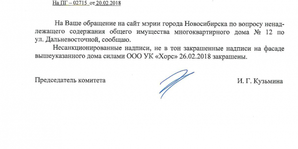 Номер жалобы:30132 Тип жалобы:Иные проблемы ЖКХ Название объекта:Управляющая Компания Регион:Новосибирская область Город:Новосибирск Адрес:Дальневосточная ул., 12 Описание жалобы:Не в тон закрашены надписи Статус: