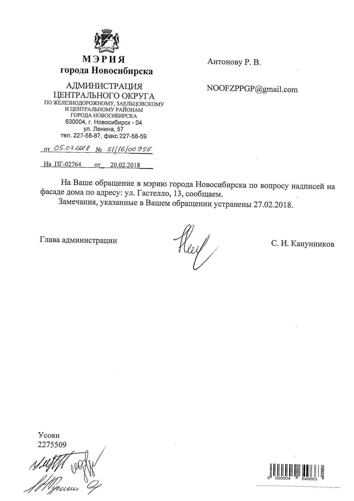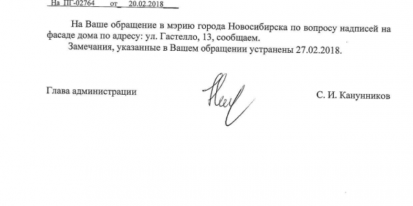 Номер жалобы:30136 Тип жалобы:Иные проблемы ЖКХ Название объекта:Управляющая Компания Регион:Новосибирская область Город:Новосибирск Адрес:ул. Гастелло, 13 Описание жалобы:Надписи закрашенны не в тон Статус: