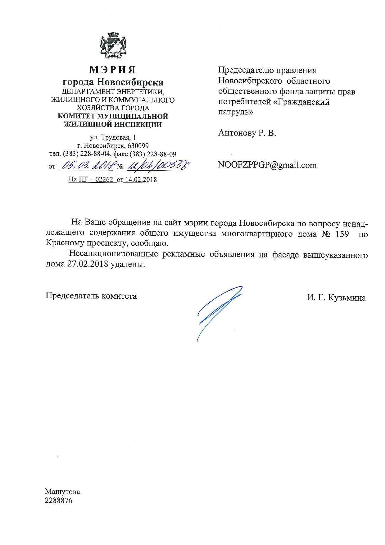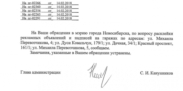 Номер жалобы:29938 Тип жалобы:Иные проблемы ЖКХ Название объекта:Управляющая Компания Регион:Новосибирская область Город:Новосибирск Адрес:ул. Михаила Перевозчикова, 4 Описание жалобы:Объявления на гараже Статус:
