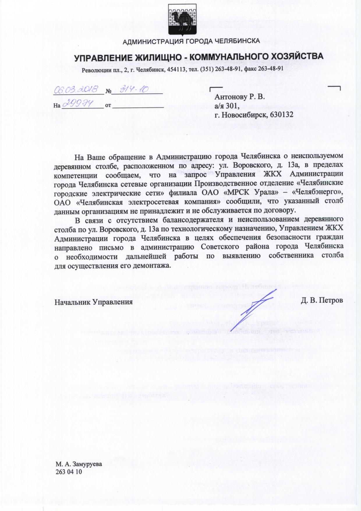 Номер жалобы:29974 Тип жалобы:Иные проблемы ЖКХ Название объекта:Администрация Советского района Регион:Челябинская область Город:Челябинск Адрес:ул. Воровского, 13А Описание жалобы:Во дворе по Воровского 13а стоит деревянная опора ЛЭП, давно неиспользуемая. По ней поднимается старый кабель, ничем не защищенный,который может являться угрозой для детей. Требуется демонтаж опоры. Статус: