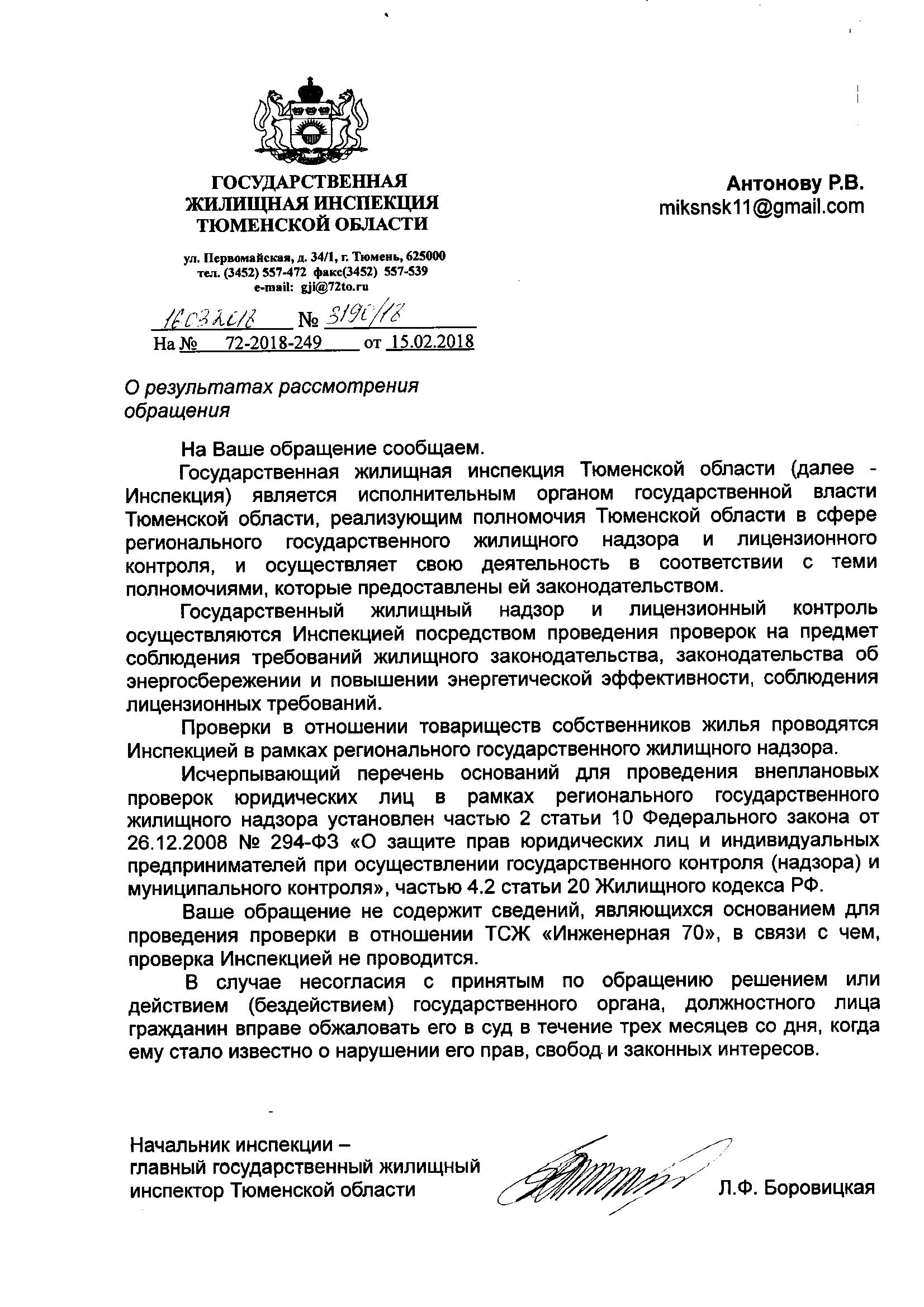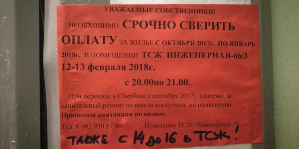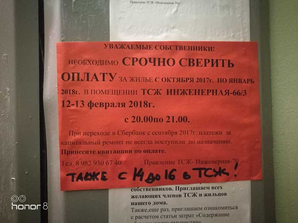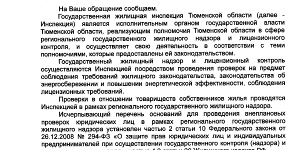 Номер жалобы:30038 Тип жалобы:Иные проблемы ЖКХ Название объекта:Тсж Инженерная 70 Регион:Тюменская область Город:Тюмень Адрес:ул. Инженерная, 70 Описание жалобы:Прошу проверить данное тсж, постоянные долги , которые пытаются вешать на жильцов . Что хотят ,то и творят ,надоели постоянные разборки . Если у них аж с ноября месяца недочёты ,на каком основании они каждый месяц начисляют квартплату и капремонт Статус: