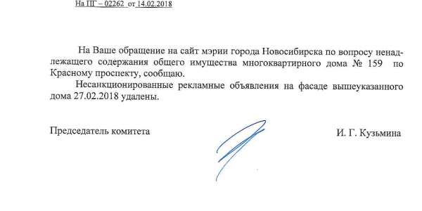 Номер жалобы:29942 Тип жалобы:Иные проблемы ЖКХ Название объекта:Управляющая Компания Регион:Новосибирская область Город:Новосибирск Адрес:Красный пр., 159 Описание жалобы:Объявления на водостоке Статус: