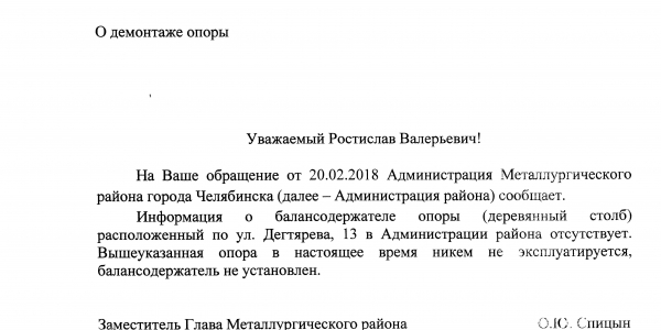 Номер жалобы:29948 Тип жалобы:Иные проблемы ЖКХ Название объекта:Администрация Металлургического Района Регион:Челябинская область Город:Челябинск Адрес:ул. Дегтярева, 13 Описание жалобы:У тротуара на Дегтярева 13 стоит старый деревянный столб ЛЭП,он давно отключен. Требуется демонтаж 359-2 Статус: