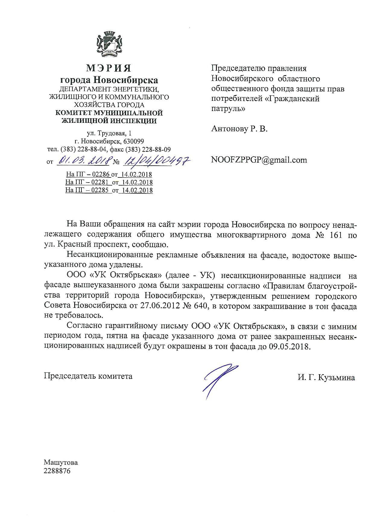 Номер жалобы:29929 Тип жалобы:Иные проблемы ЖКХ Название объекта:Управляющая Компания Регион:Новосибирская область Город:Новосибирск Адрес:Красный пр., 161 Описание жалобы:Надписи на хозяйственном корпусе Статус: