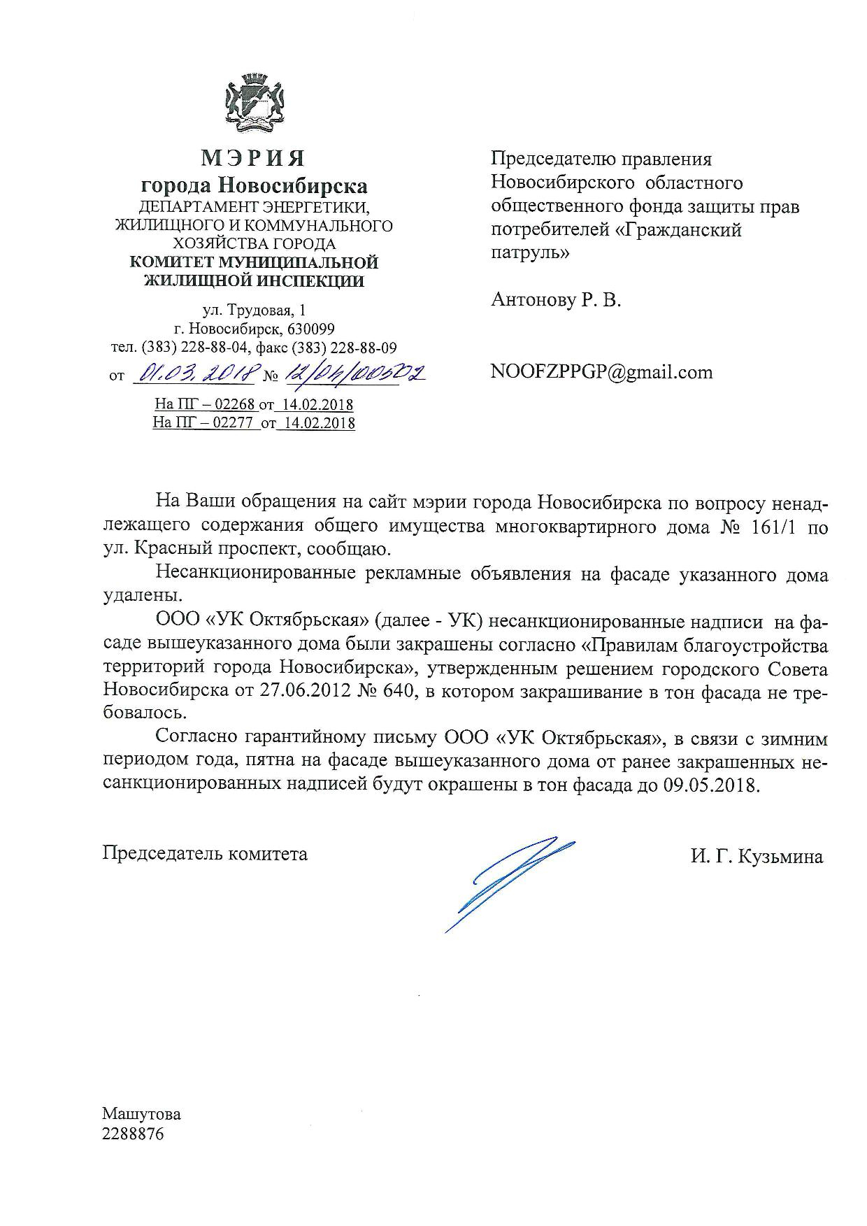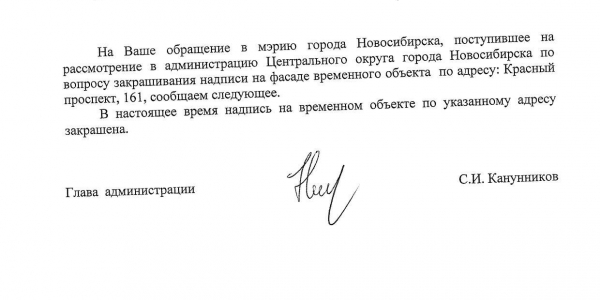 Номер жалобы:29935 Тип жалобы:Иные проблемы ЖКХ Название объекта:Управляющая Компания Регион:Новосибирская область Город:Новосибирск Адрес:Красный пр., 161/1 Описание жалобы:Надписи закрашены не в тон Статус: