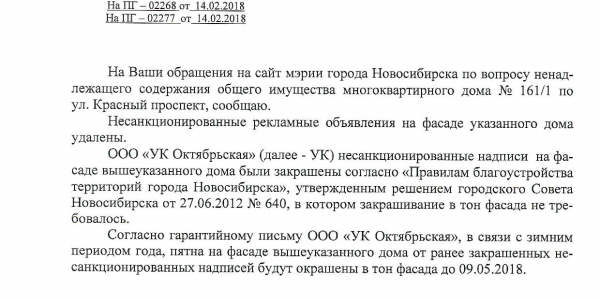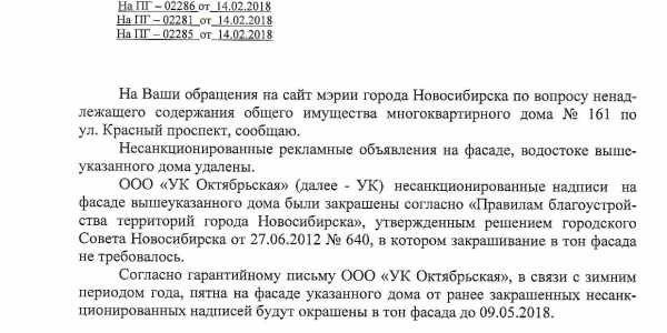 Номер жалобы:29928 Тип жалобы:Иные проблемы ЖКХ Название объекта:Управляющая Компания Регион:Новосибирская область Город:Новосибирск Адрес:Красный пр., 161 Описание жалобы:Надписи на фасаде дома Статус: