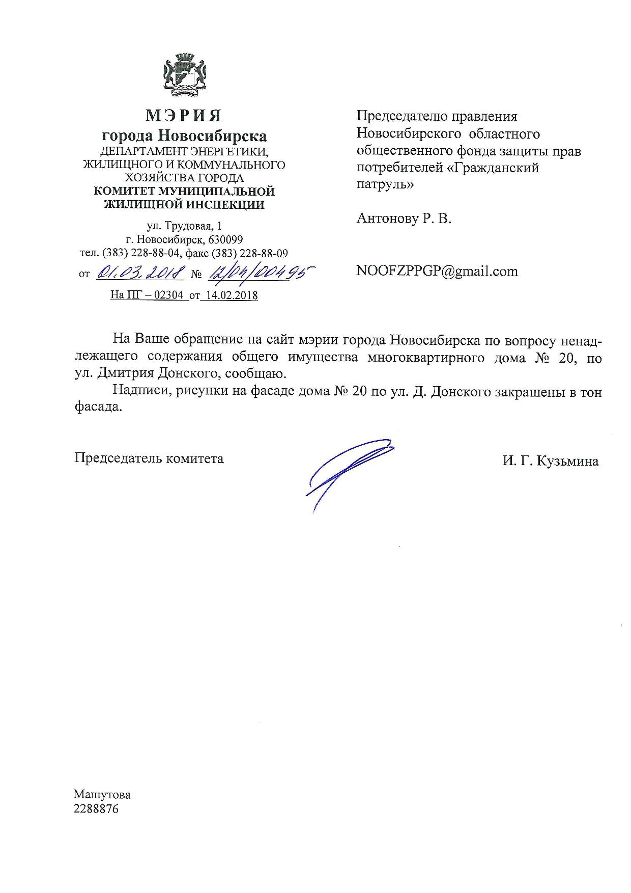 Номер жалобы:29882 Тип жалобы:Иные проблемы ЖКХ Название объекта:Управляющая Компания Регион:Новосибирская область Город:Новосибирск Адрес:ул. Дмитрия Донского, 18 Описание жалобы:Надписи на фасаде содержащие рекламу Статус: