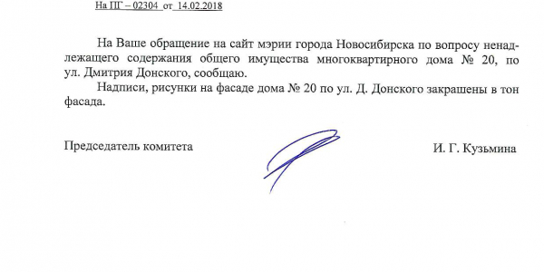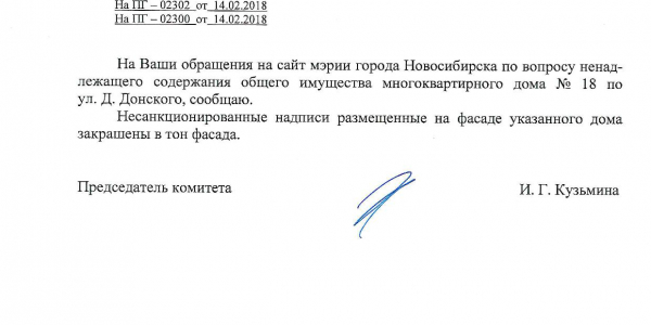 Номер жалобы:29880 Тип жалобы:Иные проблемы ЖКХ Название объекта:Управляющая Компания Регион:Новосибирская область Город:Новосибирск Адрес:ул. Дмитрия Донского, 20 Описание жалобы:Надписи на фасаде дома Статус: