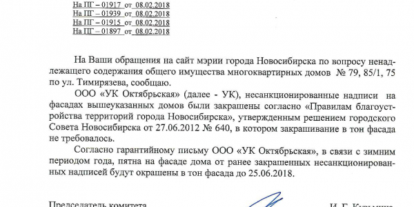 Номер жалобы:29608 Тип жалобы:Иные проблемы ЖКХ Название объекта:Управляющая Компания Регион:Новосибирская область Город:Новосибирск Адрес:ул. Тимирязева, 77 Описание жалобы:Надписи закрашены не в тон Статус: