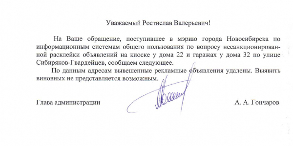 Номер жалобы:29628 Тип жалобы:Иные проблемы ЖКХ Название объекта:Управляющая Компания Город:Новосибирск Адрес:Новосибирск, улица Сибиряков-Гвардейцев, 32 Описание жалобы:Объявления на гаражах Статус: