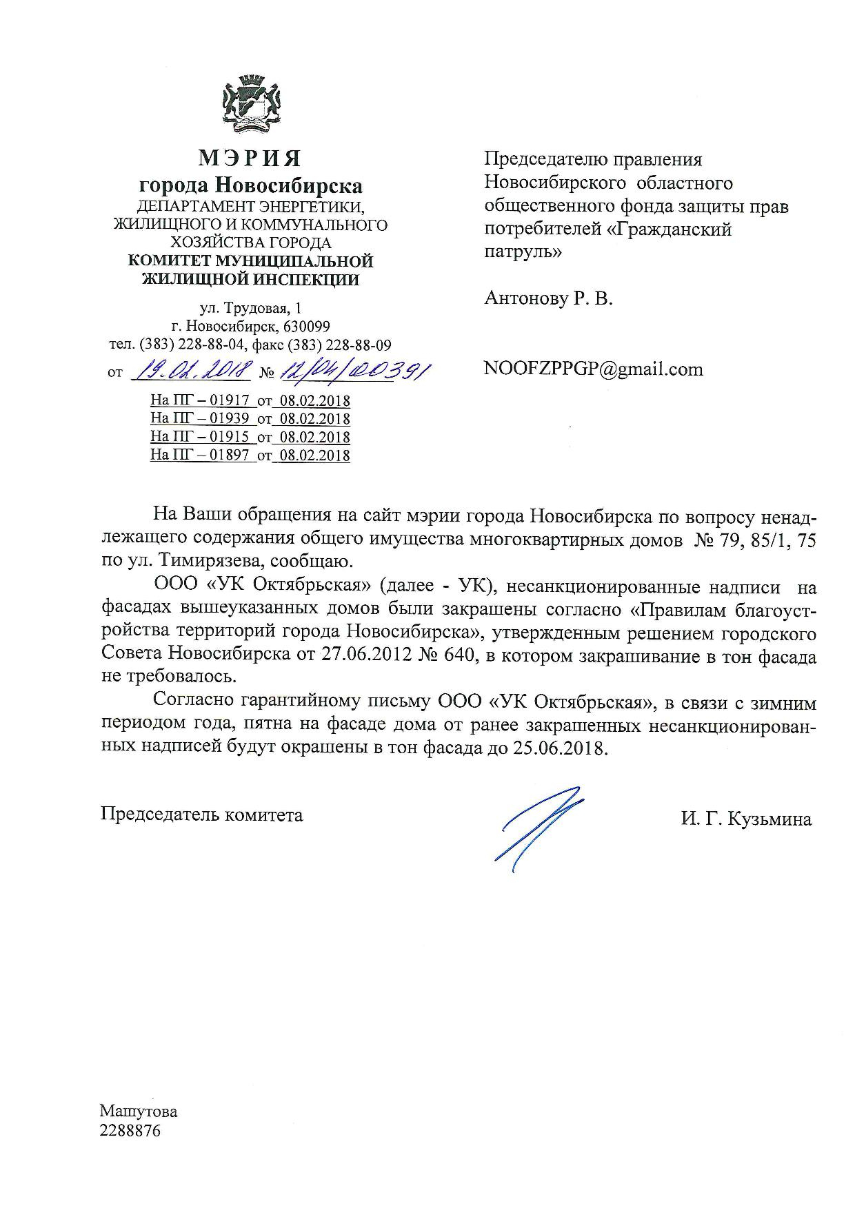 Номер жалобы:29576 Тип жалобы:Иные проблемы ЖКХ Название объекта:Управляющая Компания Регион:Новосибирская область Город:Новосибирск Адрес:ул. Тимирязева, 85/2 Описание жалобы:Тимирязева 85, надписи закрашены не в тон Статус: