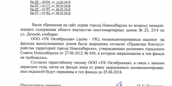 Номер жалобы:29570 Тип жалобы:Иные проблемы ЖКХ Название объекта:Управляющая Компания Регион:Новосибирская область Город:Новосибирск Адрес:ул. Дачная, 25/4 Описание жалобы:Надписи закрашены не в тон Статус: