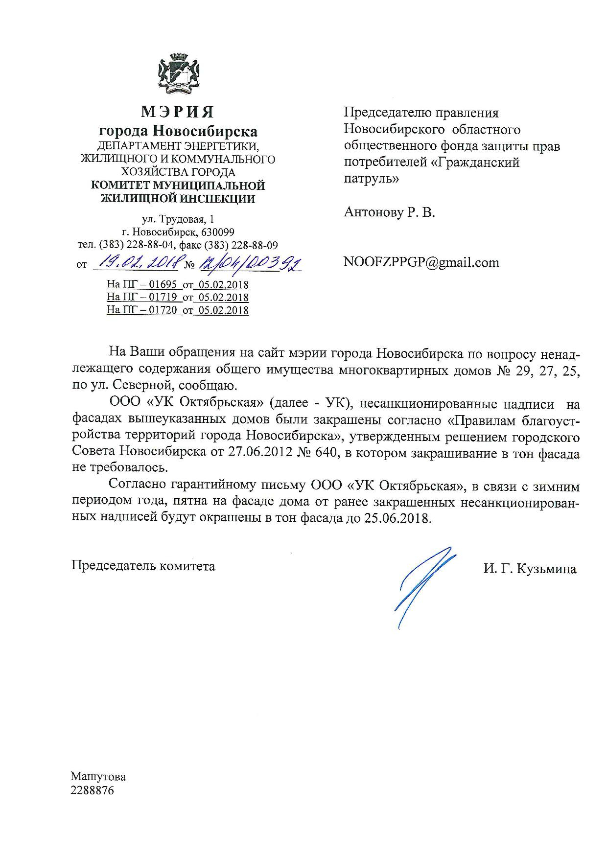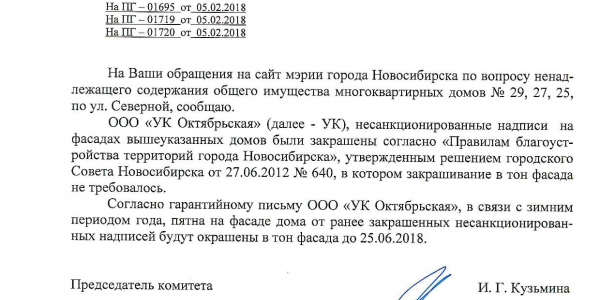 Номер жалобы:29497 Тип жалобы:Иные проблемы ЖКХ Название объекта:Управляющая Компания Регион:Новосибирская область Город:Новосибирск Адрес:ул. Северная, 29 Описание жалобы:Не в тон закрашенные надписи Статус: