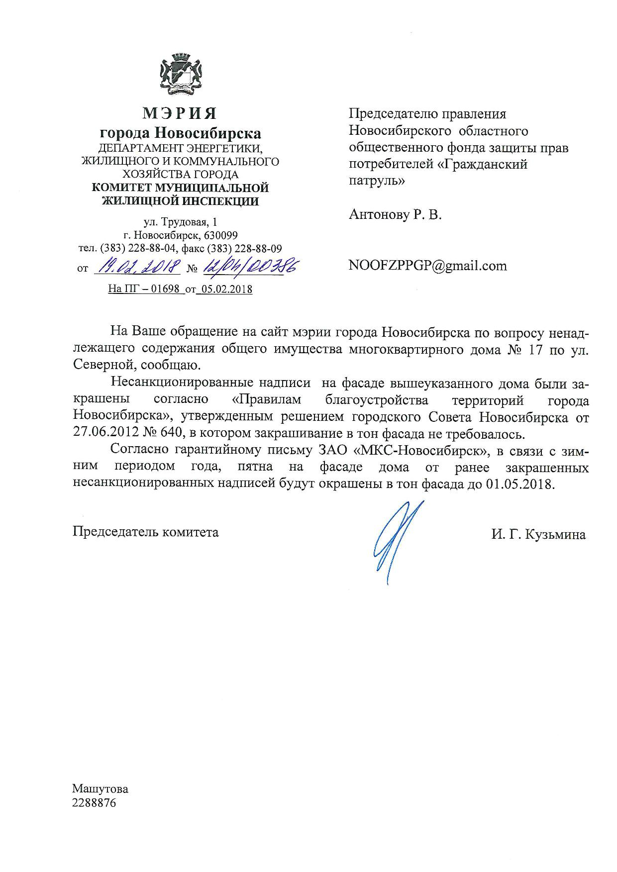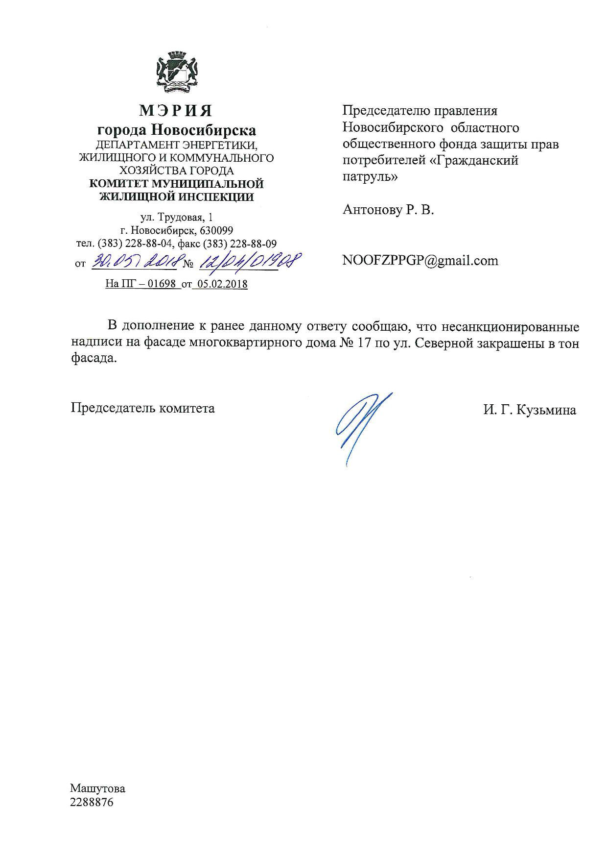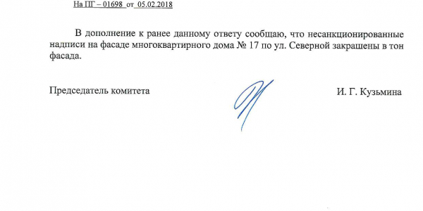 Номер жалобы:29488 Тип жалобы:Иные проблемы ЖКХ Название объекта:Управляющая Компания Регион:Новосибирская область Город:Новосибирск Адрес:ул. Северная, 17 Описание жалобы:Не в тон закрашенные надписи Статус: