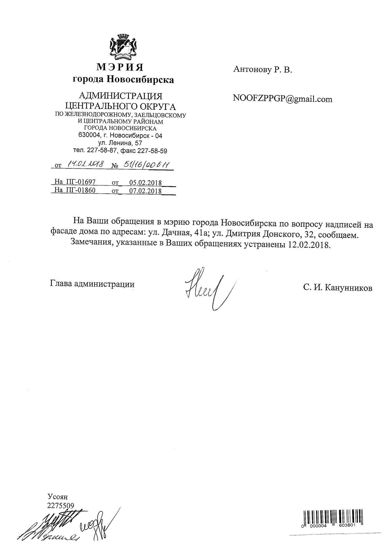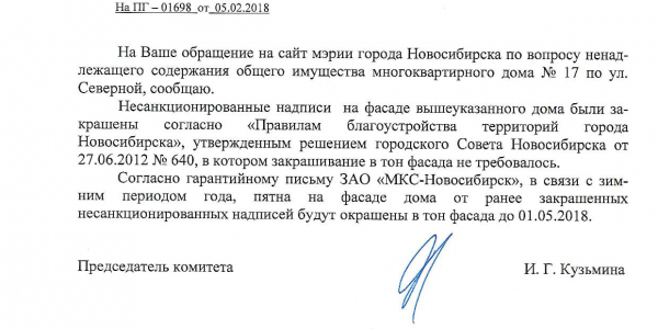 Номер жалобы:29490 Тип жалобы:Иные проблемы ЖКХ Название объекта:Управляющая Компания Регион:Новосибирская область Город:Новосибирск Адрес:ул. Дачная, 41А Описание жалобы:Надписи на фасаде дома Статус: