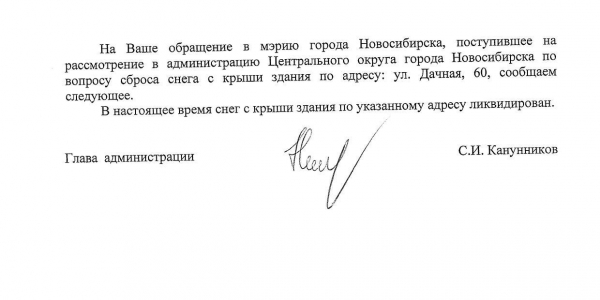 Номер жалобы:29486 Тип жалобы:Иные проблемы ЖКХ Название объекта:Управляющая Компания Регион:Новосибирская область Город:Новосибирск Адрес:ул. Дачная, 37/1 Описание жалобы:Дачная 37, снег на крыше Статус: