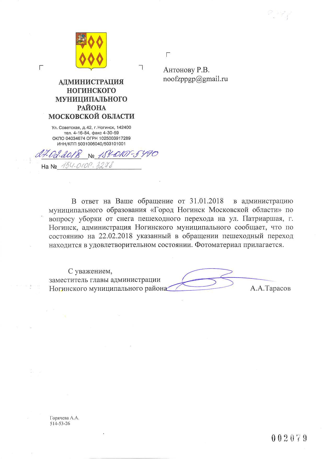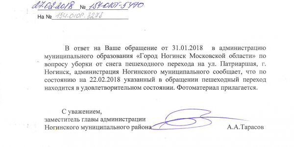 Номер жалобы:29398 Тип жалобы:Иные проблемы ЖКХ Название объекта:Администрация Ногинского Района Регион:Московская область Город:Ногинск Адрес:ул. Патриаршая, 6 Описание жалобы:Своевременно не убирается снег Статус: