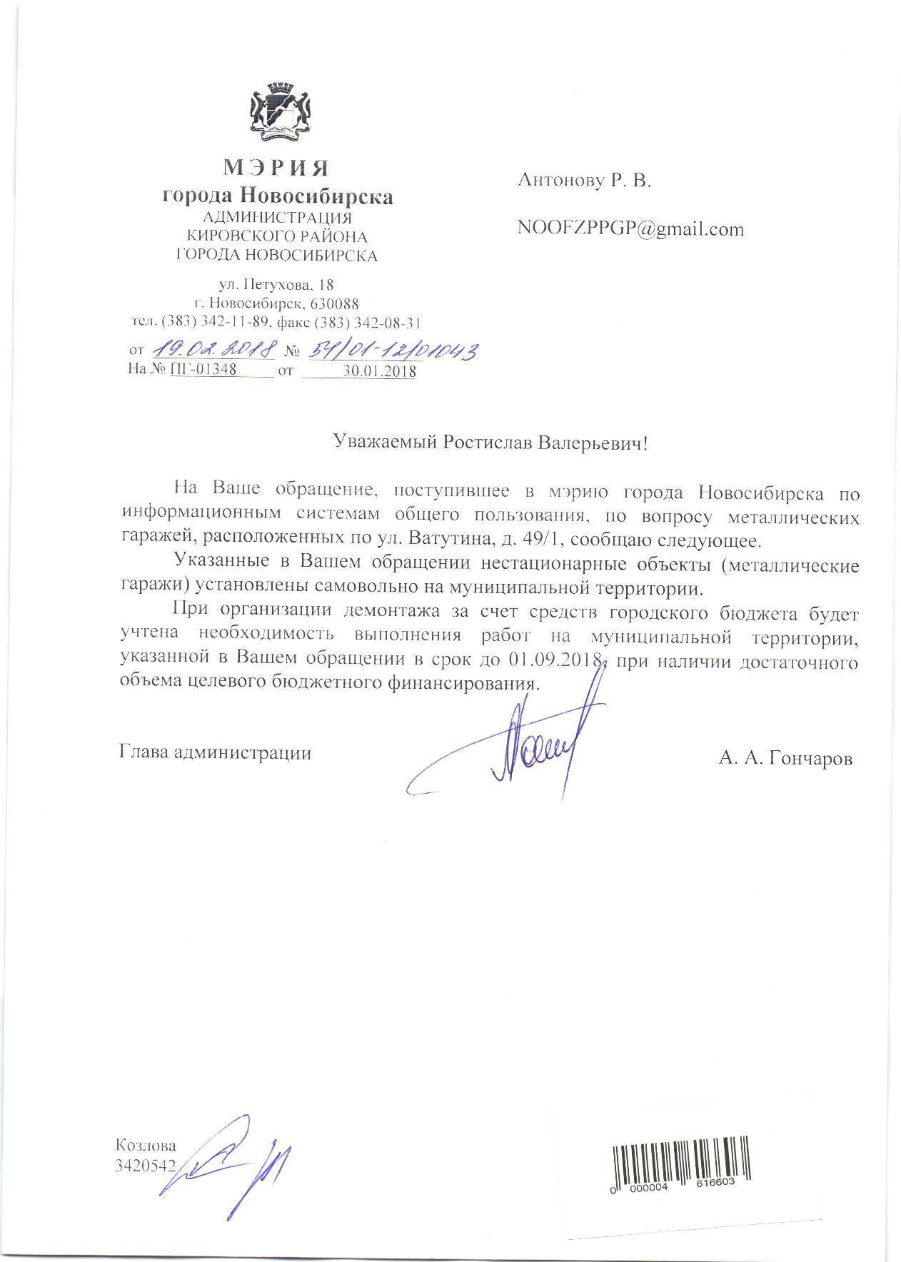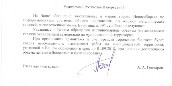 Номер жалобы:29312 Тип жалобы:Иные проблемы ЖКХ Название объекта:Управляющая Компания Город:Новосибирск Адрес:Новосибирск, улица Ватутина, 49/1 Описание жалобы:Гаражи за домом Статус: