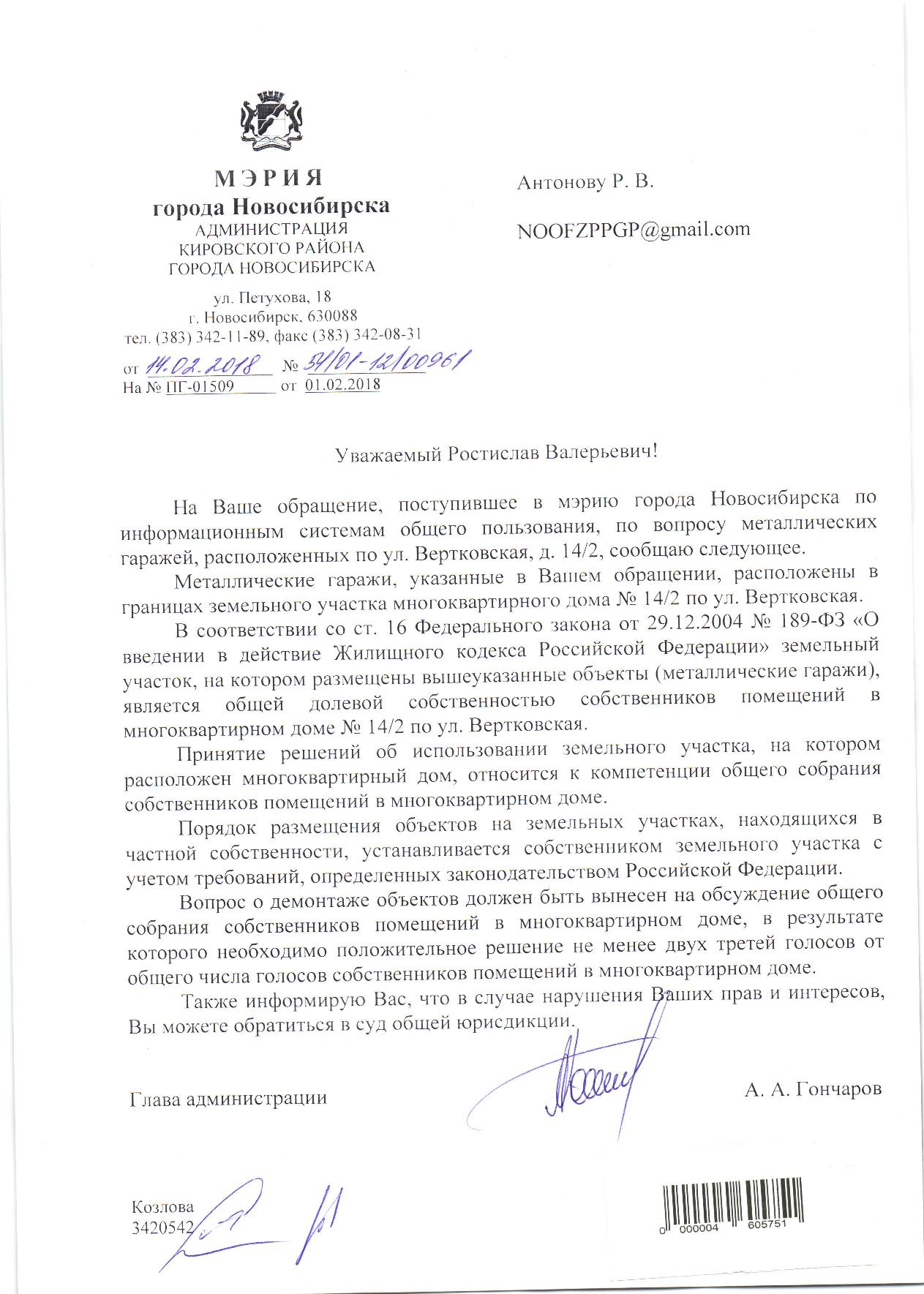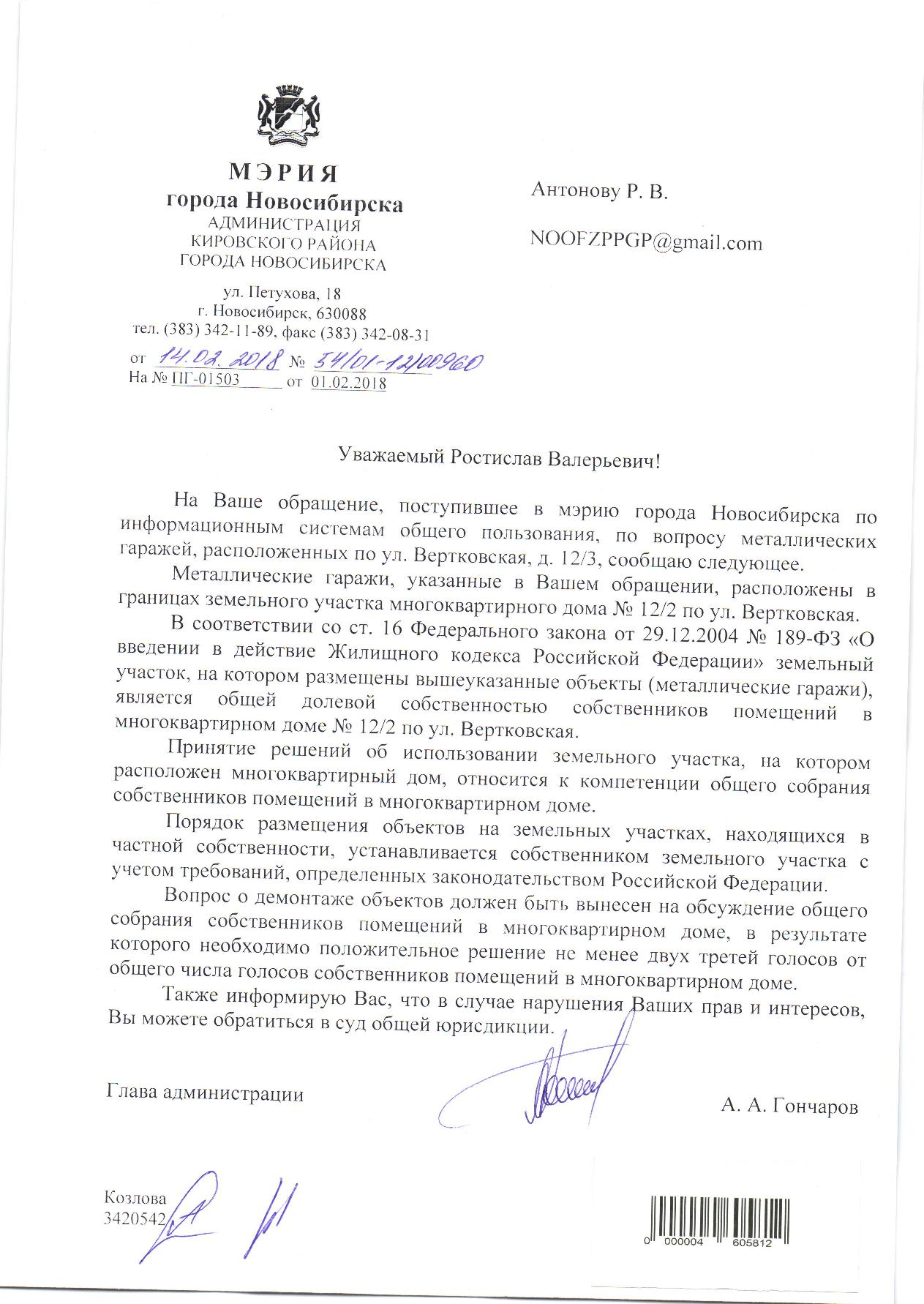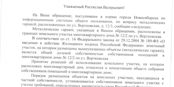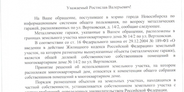 Номер жалобы:29369 Тип жалобы:Иные проблемы ЖКХ Название объекта:Управляющая Компания Город:Новосибирск Адрес:Новосибирск, улица Вертковская, 14/2 Описание жалобы:Гаражи Статус: