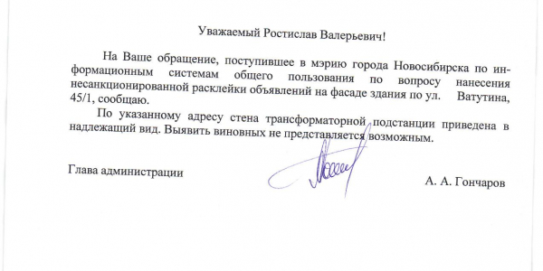 Номер жалобы:29304 Тип жалобы:Иные проблемы ЖКХ Название объекта:Управляющая Компания Город:Новосибирск Адрес:Новосибирск, улица Ватутина, 45/1 Описание жалобы:Объявления Статус: