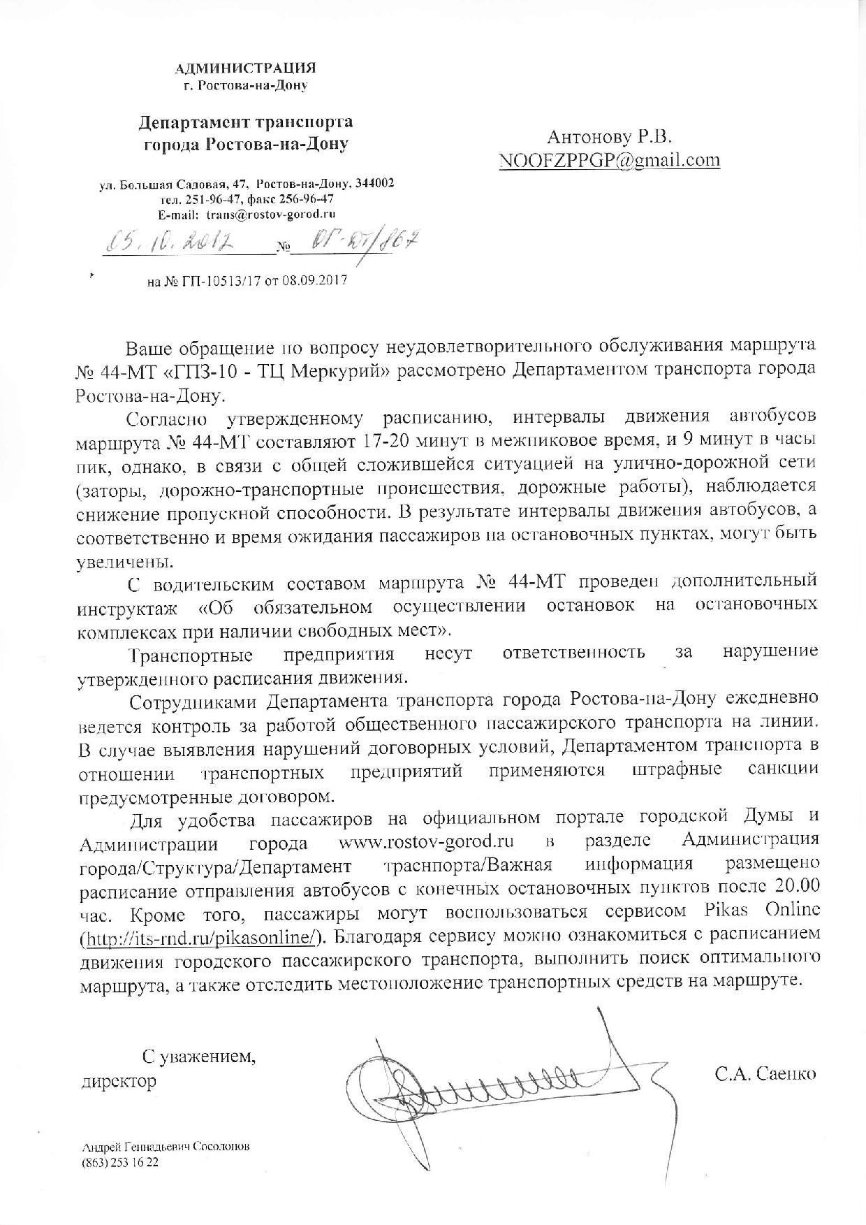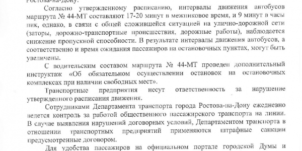 Номер жалобы:24492 Тип жалобы:Прочее Название объекта:Департамент транспорта г.Ростов-на-Дону Город:Ростов-на-Дону Адрес:Ул. Шеболдаева Описание жалобы:29.08.2017 17:51:38 Маршрутное такси № 44