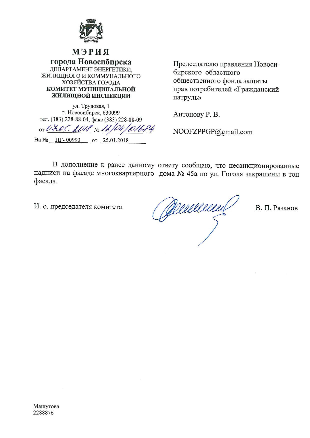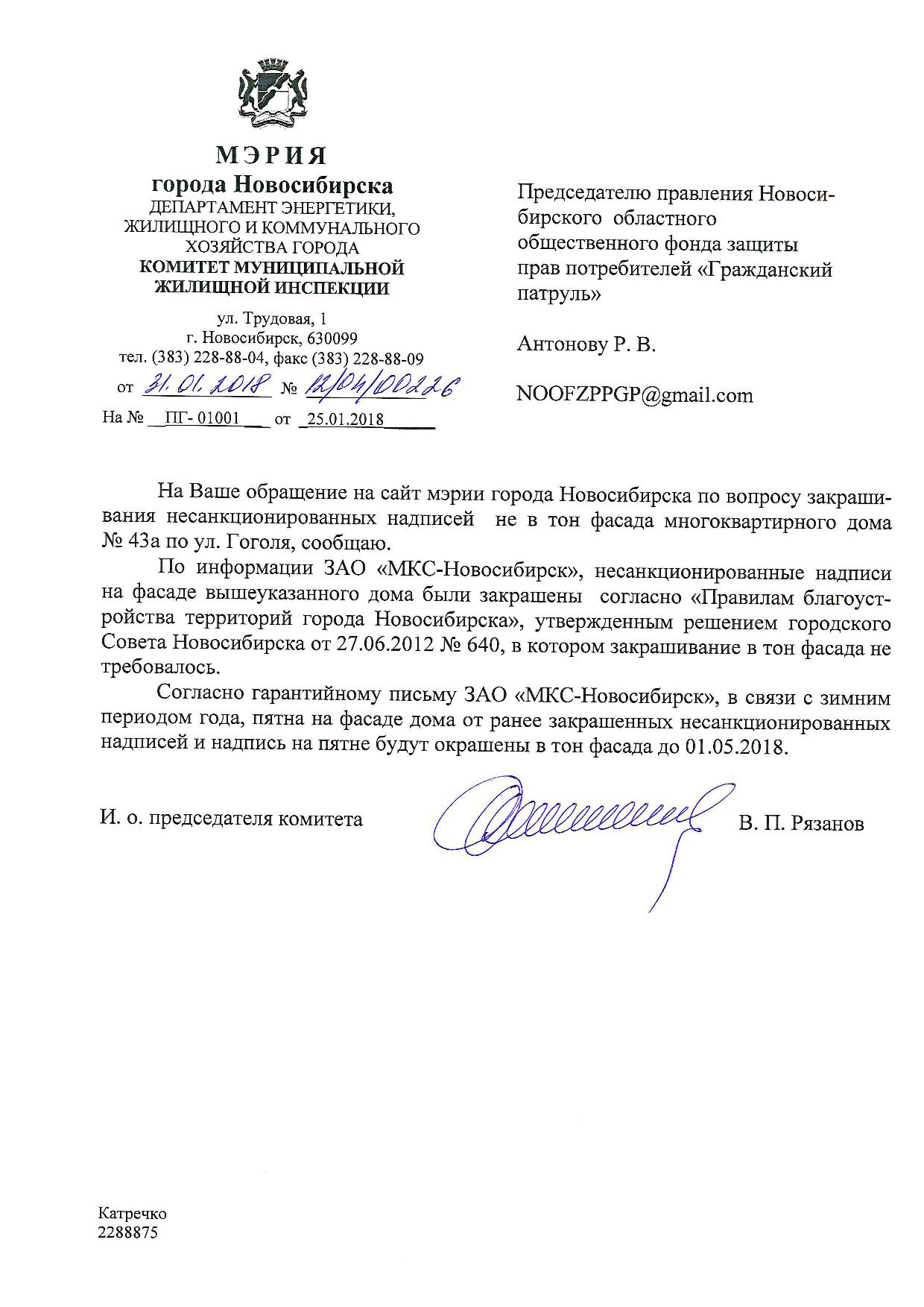 Номер жалобы:29050 Тип жалобы:Иные проблемы ЖКХ Название объекта:Управляющая Компания Регион:Новосибирская область Город:Новосибирск Адрес:ул. Гоголя, 45А Описание жалобы:Не в тон закрашенные надписи Статус: