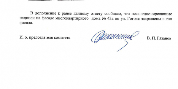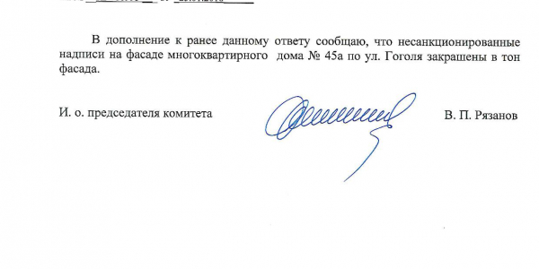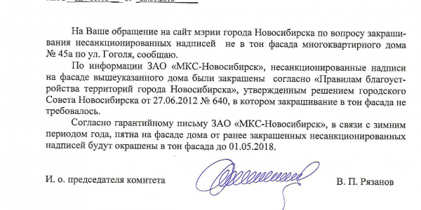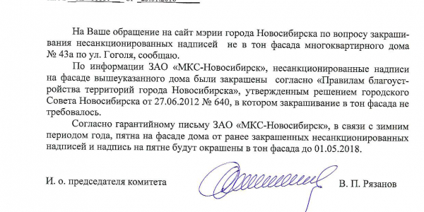 Номер жалобы:29053 Тип жалобы:Иные проблемы ЖКХ Название объекта:Управляющая Компания Регион:Новосибирская область Город:Новосибирск Адрес:ул. Гоголя, 43А Описание жалобы:Надписи на фасаде дома Статус: