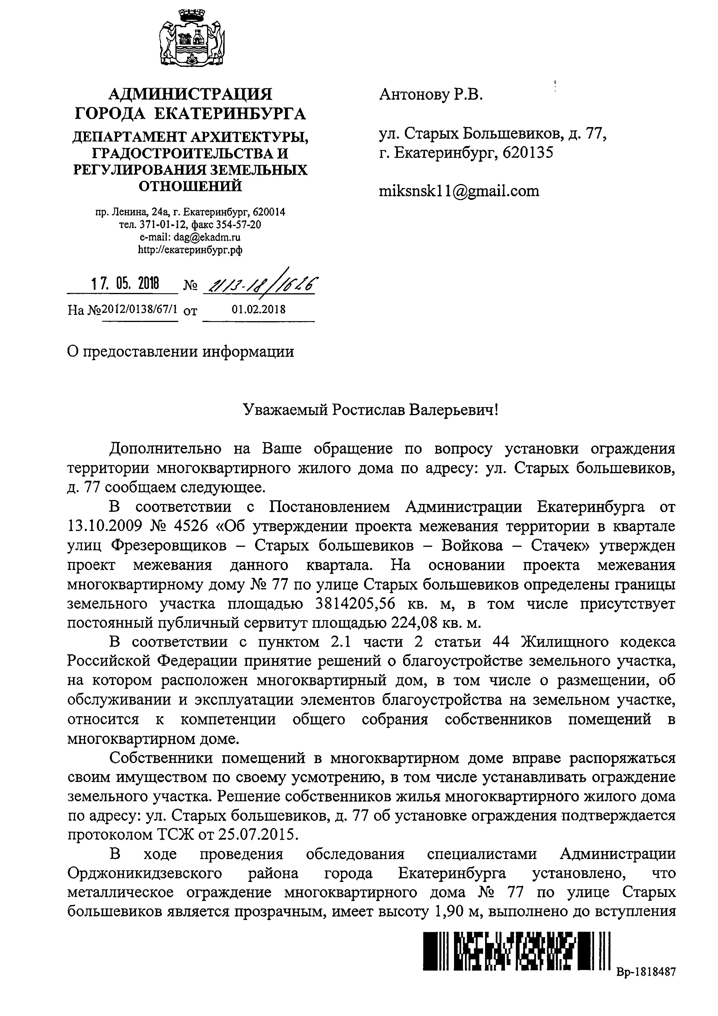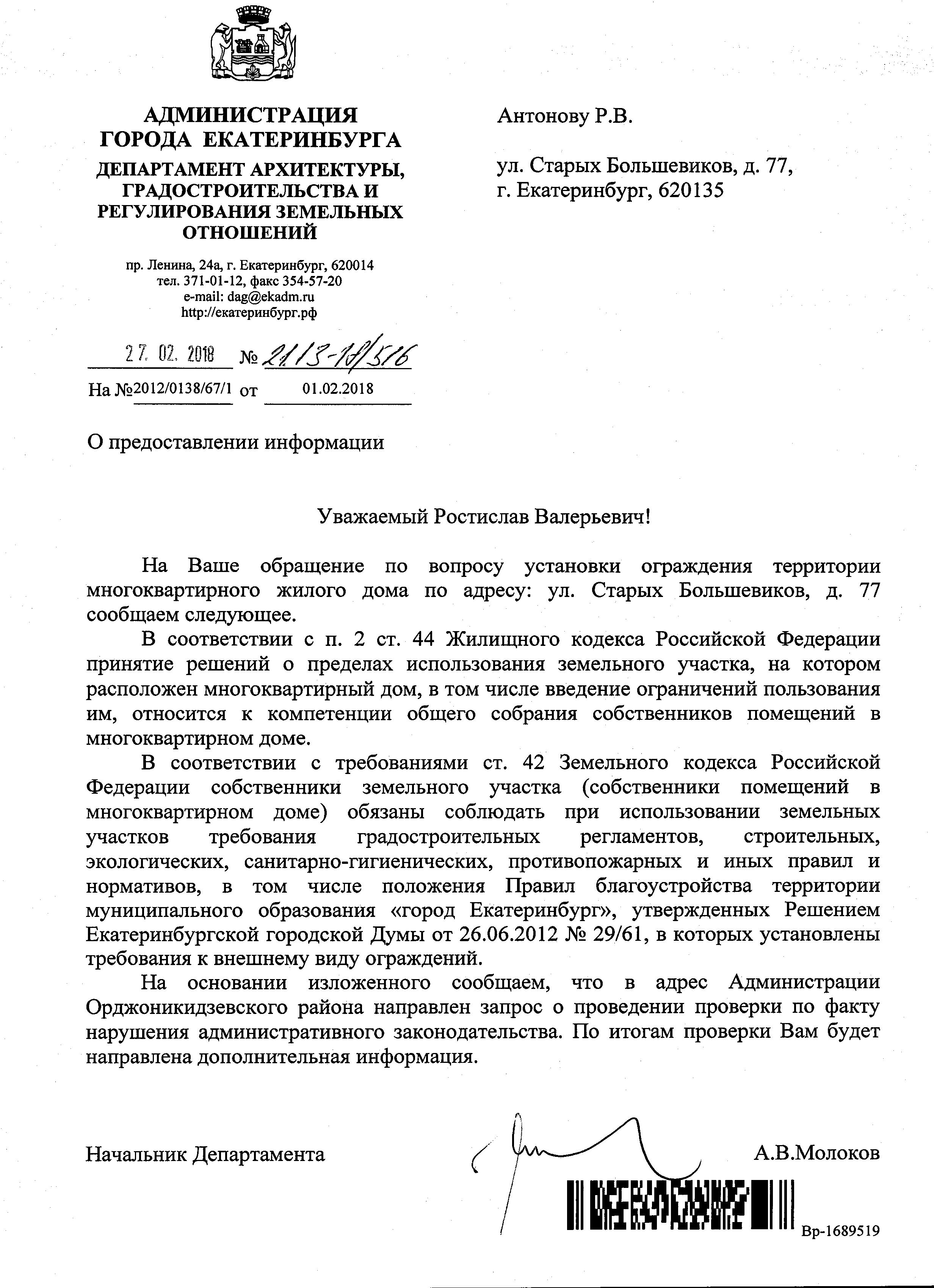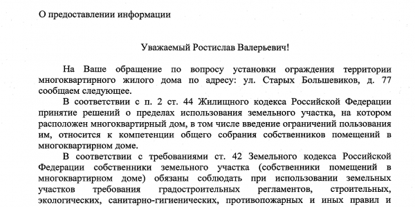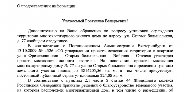 Номер жалобы:28854 Тип жалобы:Иные проблемы ЖКХ Название объекта:- Регион:Свердловская область Город:Екатеринбург Адрес:улица Старых Большевиков, 77 Описание жалобы:В настоящее время на придомовой территории многоквартирного жилого дома 77 по улице Старых Большевиков ведутся работы по установке забора. Согласно п. 143 Правил благоустройства территории муниципального образования «город Екатеринбург», ограждения в границах квартала по всей протяженности обращенных к улице сторон должны иметь единообразный вид, высоту и цветовое решение, гармонирующее с окружающей застройкой. Для многоквартирных жилых домов среднеэтажной и многоэтажной застройки, не образующих замкнутое единое дворовое пространство, а также при наличии внутри квартала объектов общественного назначения и транзитных пешеходных путей высота ограждения не должна превышать 0,9 м. Установка сплошных ограждений не допускается. Несмотря на то, что территория многоквартирного жилого дома 77 по улице Старых Большевиков не образует замкнутое единое дворовое пространство, а внутри квартала расположены детские сады №274 «Надежда», №551 «Солнышко» и жилые дома 11, 13, 15, 17 и 17а по переулку Ристланда, она обносится сплошным забором высотой 1,8–1,9 м. Вид, высота и цвет новых ограждений отличается от существовавших в квартале на момент их установки ограждений детских садов №274 и №551. Необходимо уменьшить высоту ограждения придомовой территории дома 77 по улице Старых Большевиков до 0,9 м, изменить его вид и цветовое решение и обеспечить беспрепятственный подход по кратчайшему пути к постройкам внутри квартала. Статус: