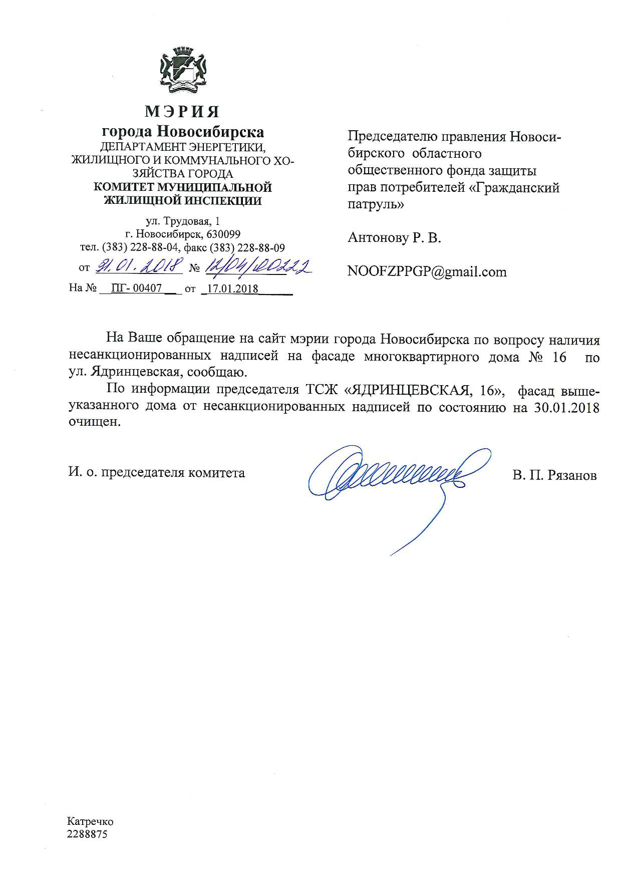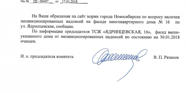 Номер жалобы:28766 Тип жалобы:Иные проблемы ЖКХ Название объекта:Управляющая Компания Регион:Новосибирская область Город:Новосибирск Адрес:Ядринцевская ул., 16 Описание жалобы:Надписи на фасаде дома Статус: