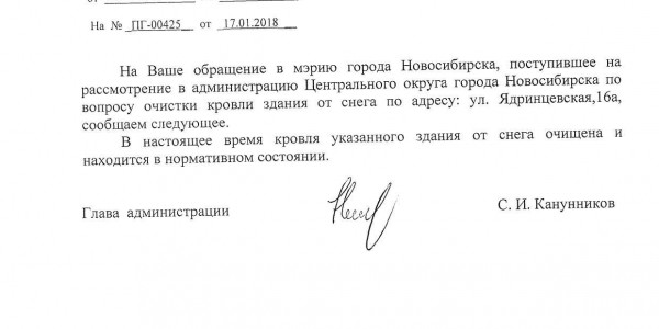 Номер жалобы:28770 Тип жалобы:Иные проблемы ЖКХ Название объекта:Управляющая Компания Регион:Новосибирская область Город:Новосибирск Адрес:Ядринцевская ул., 16А Описание жалобы:Снег на крыше Статус: