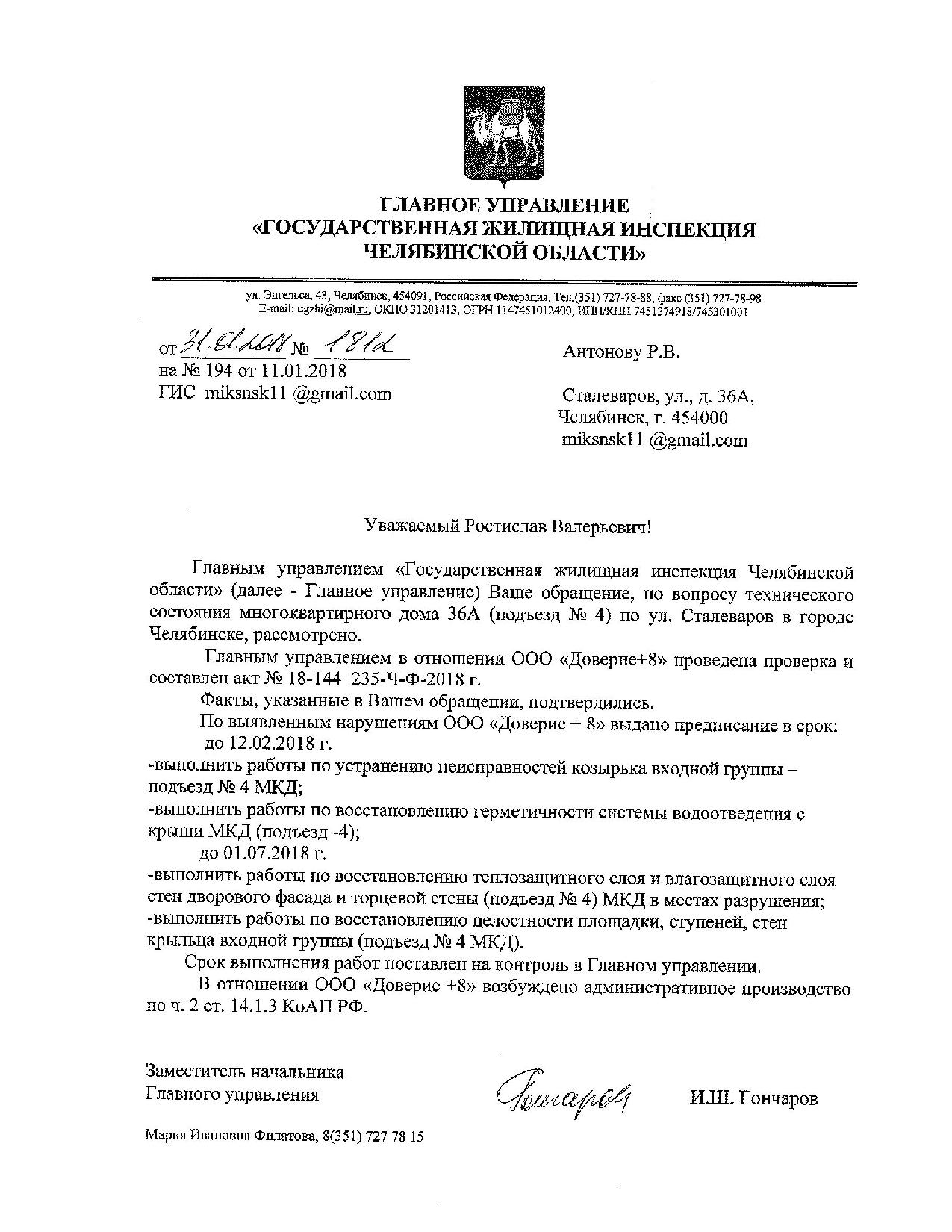 Номер жалобы:28490 Тип жалобы:Иные проблемы ЖКХ Название объекта:ООО Доверие -8 Регион:Челябинская область Город:Челябинск Адрес:ул. Сталеваров, 36А Описание жалобы:В угловом подъезде, где квартиры 40е, очень неудобно сделан козырек над подъездов, с него вода стекает прямо на лестницы, потом замерзает и там все время ледяная корка, очень опасно там спускаться. Там же безграмотно сделана водосточная труба. С неё стекает прямо на тротуар, также все замерзает, и там все время ледяная корка. Статус: