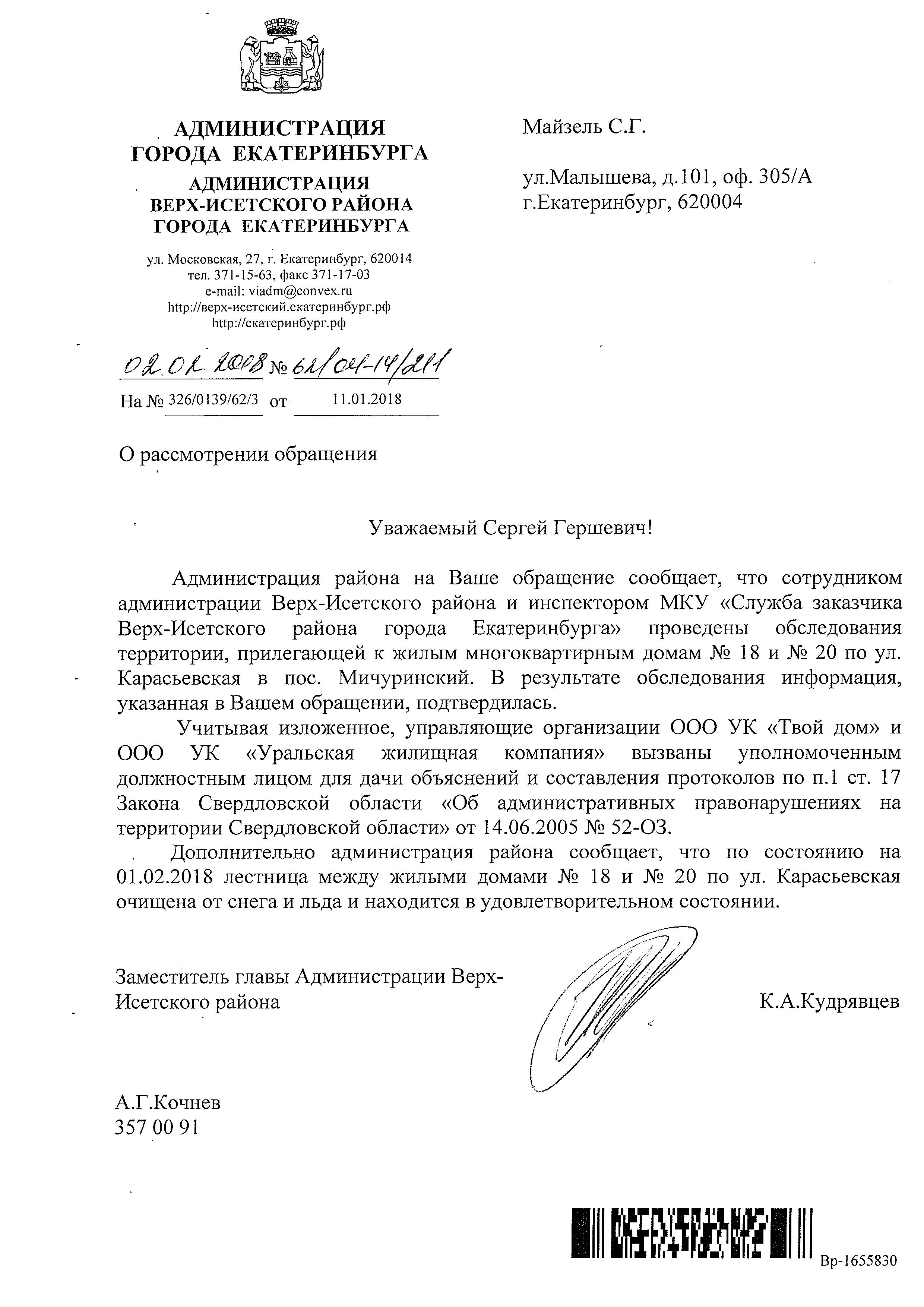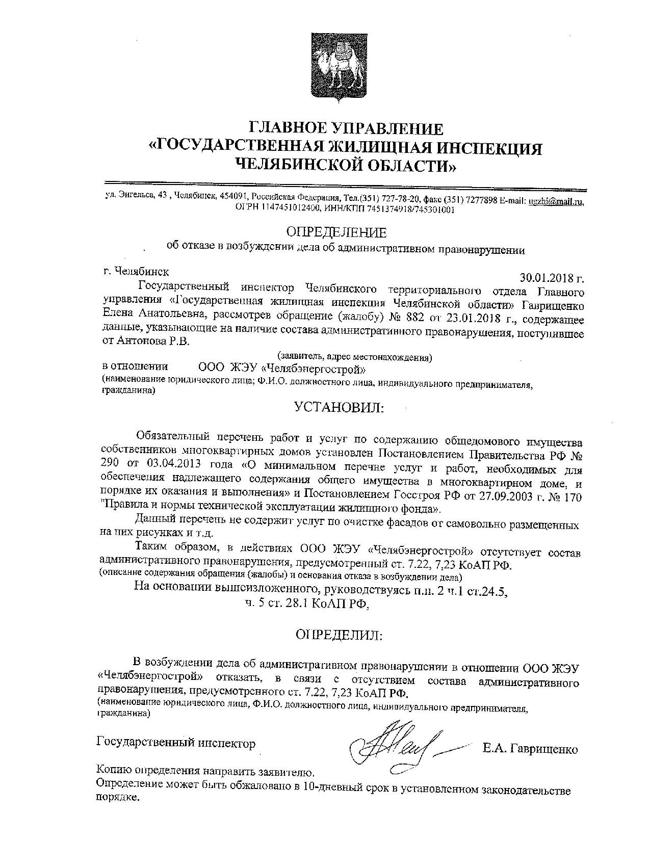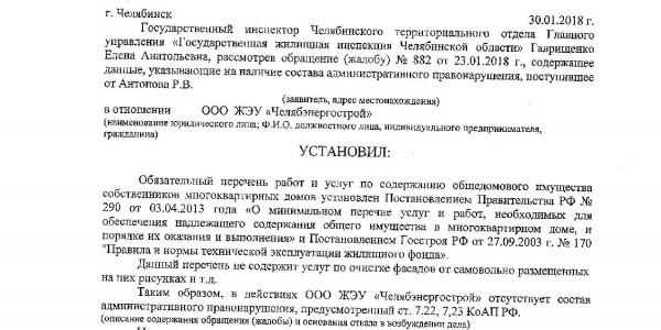 Номер жалобы:28663 Тип жалобы:Иные проблемы ЖКХ Название объекта:ООО Челябэнергострой ЖЭУ. +7(351)282-83-01 Регион:Челябинская область Город:Челябинск Адрес:ул. Трубников, 63 Описание жалобы:Незаконная реклама на фасаде дома ул. Трубников 63 в виде граффити. Компания об этом поставлена в известность двадцатых числах декабря 2017 года. По состоянию на 13.01 не устранено. Статус: