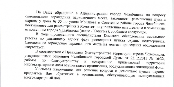 Номер жалобы:28545 Тип жалобы:Иные проблемы ЖКХ Название объекта:Мэрия Город:Челябинск Адрес:Челябинск, Переселенческая улица, 21 Описание жалобы:Незаконная будка во дворе между Монакова 35 и 31. Необходимо снести. Статус: